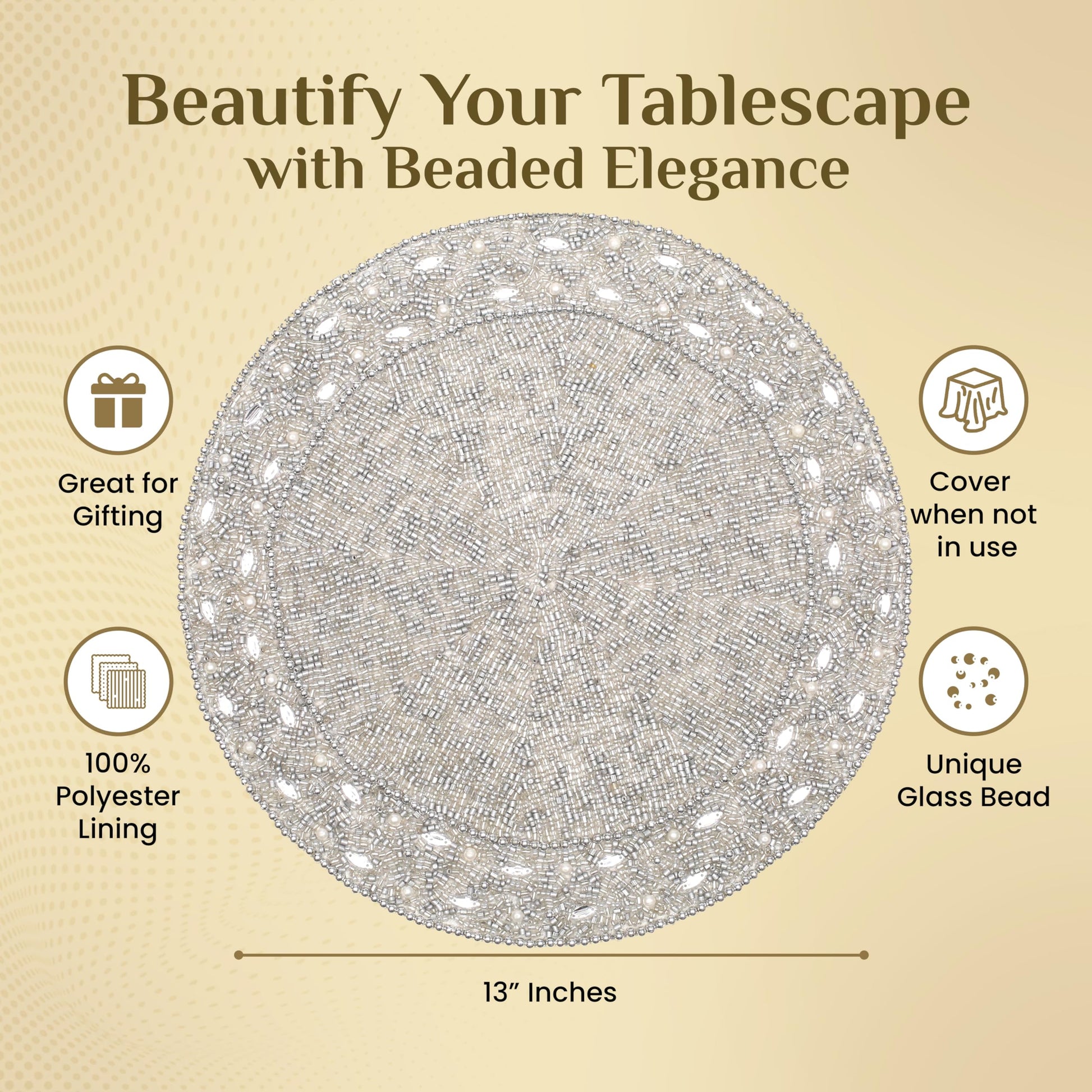 • ✅ WIPE-CLEAN CARE: Simply wipe with a soft, damp cloth to remove dust or spills. Avoid soaking or washing. This low-maintenance beaded placemat is stain-resistant and built to retain its sparkle and structure-perfect for reuse across seasons.