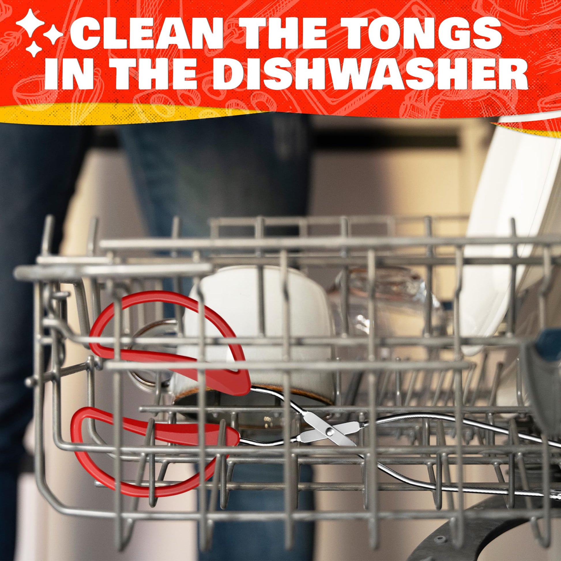 • Ergonomic Grip: These 2-in-1 stainless steel tongs combine a hamburger spatula with long BBQ tongs, offering an easy grip. The kitchen scissor tongs for cooking are dishwasher safe for quick cleanup