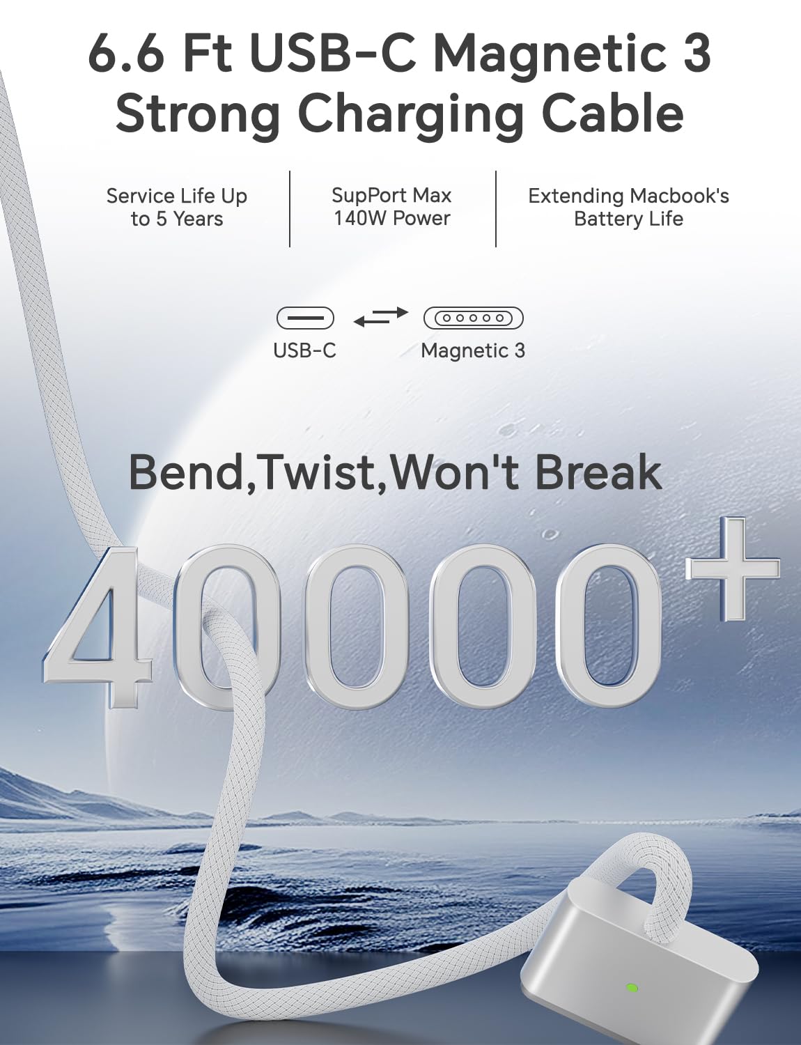 • 2M / 6.6FT Strong Magnetic Charging Cable: This Gen3 magnetic cable is designed to provide a secure and stable connection for( use with) MacBook devices, minimizing accidental disconnects and enhancing device protection. With a convenient 2-meter length, it offers extended reach for flexible charging. The built-in LED indicator displays yellow while charging and turns green when fully charged, providing instant feedback on your device's power status.