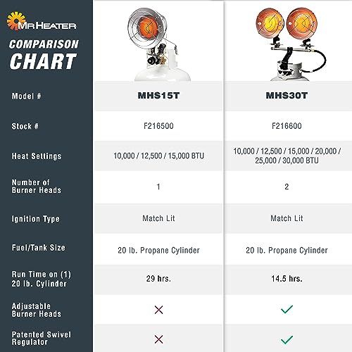 Details: The 10,000 - 15,000 BTU single tank top radiant propane heater is the perfect solution for reliable heat in a variety of outdoor applications. Easy and quiet operation, along with a tip-over safety shut-off will bring you peace of mind, whether at the job site, campsite, or tailgating for your favorite team. Features a soft nose P.O.L. and adjustable regulator with three heat settings - 10,000, 12,500 and 15,000 BTUs. Mounts directly to a 20 lb propane tank with up to a 29 hour run time on high.