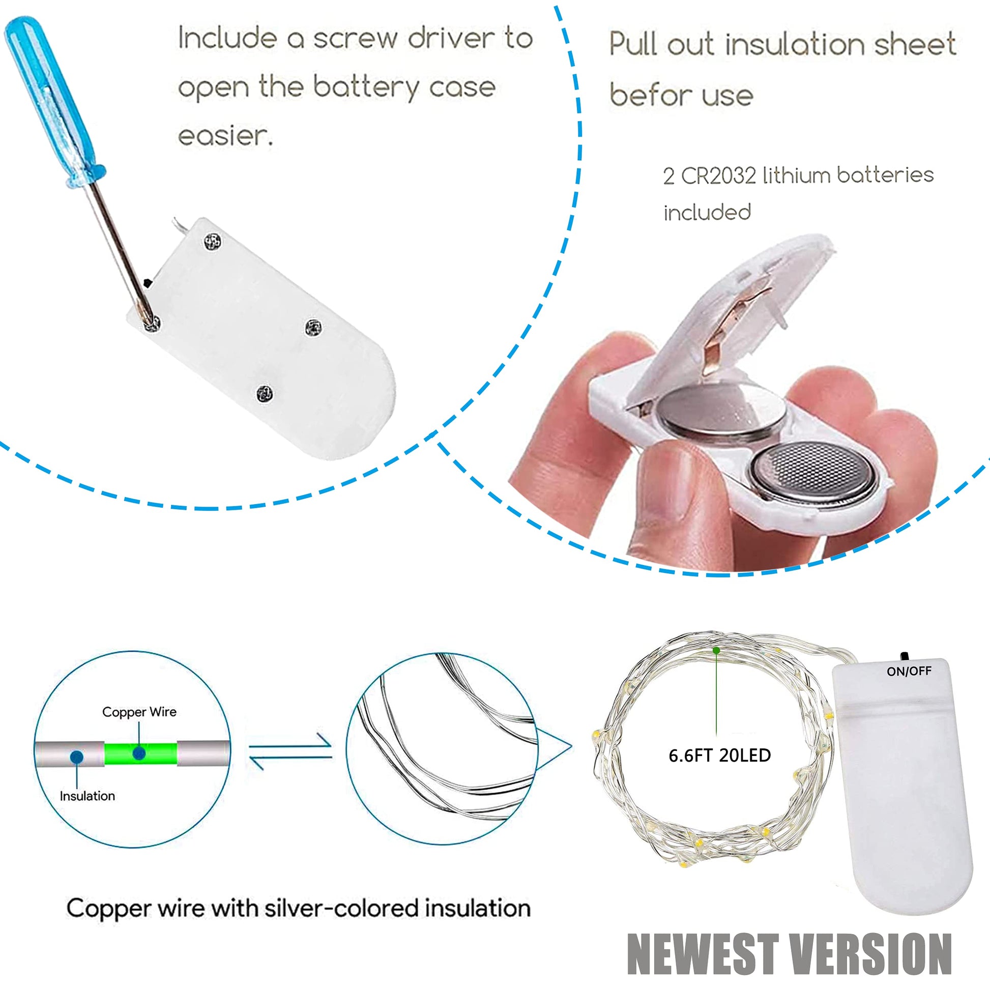 • ✨PACK OF 15 UNITS - SmilingTown 15 pack LED Fairy String lights are mainly made of high quality 3.9in long flexible silver coated copper wires, with 20 Micro LED Beads.2 x CR2032 batteries per lights and a screwdriver included.