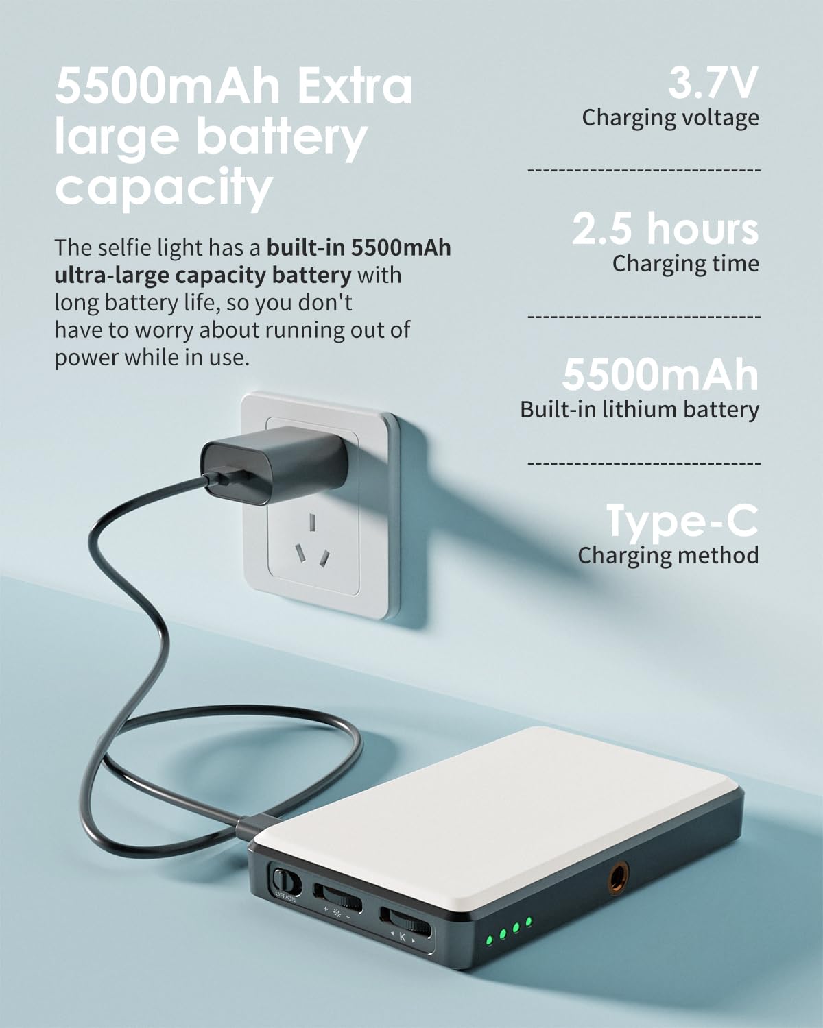 • Built-in High Capacity Rechargeable Battery:The light for phone built-in 5500mAh high-capacity battery, and has long battery life. The selfie light for iphone can be charged through devices with Type-C ports, such as laptops, PCs, power banks, USB chargers, car chargers, etc. You can charge it quickly with a charging cable at any time without worrying about running low, and enjoy your photo time.
