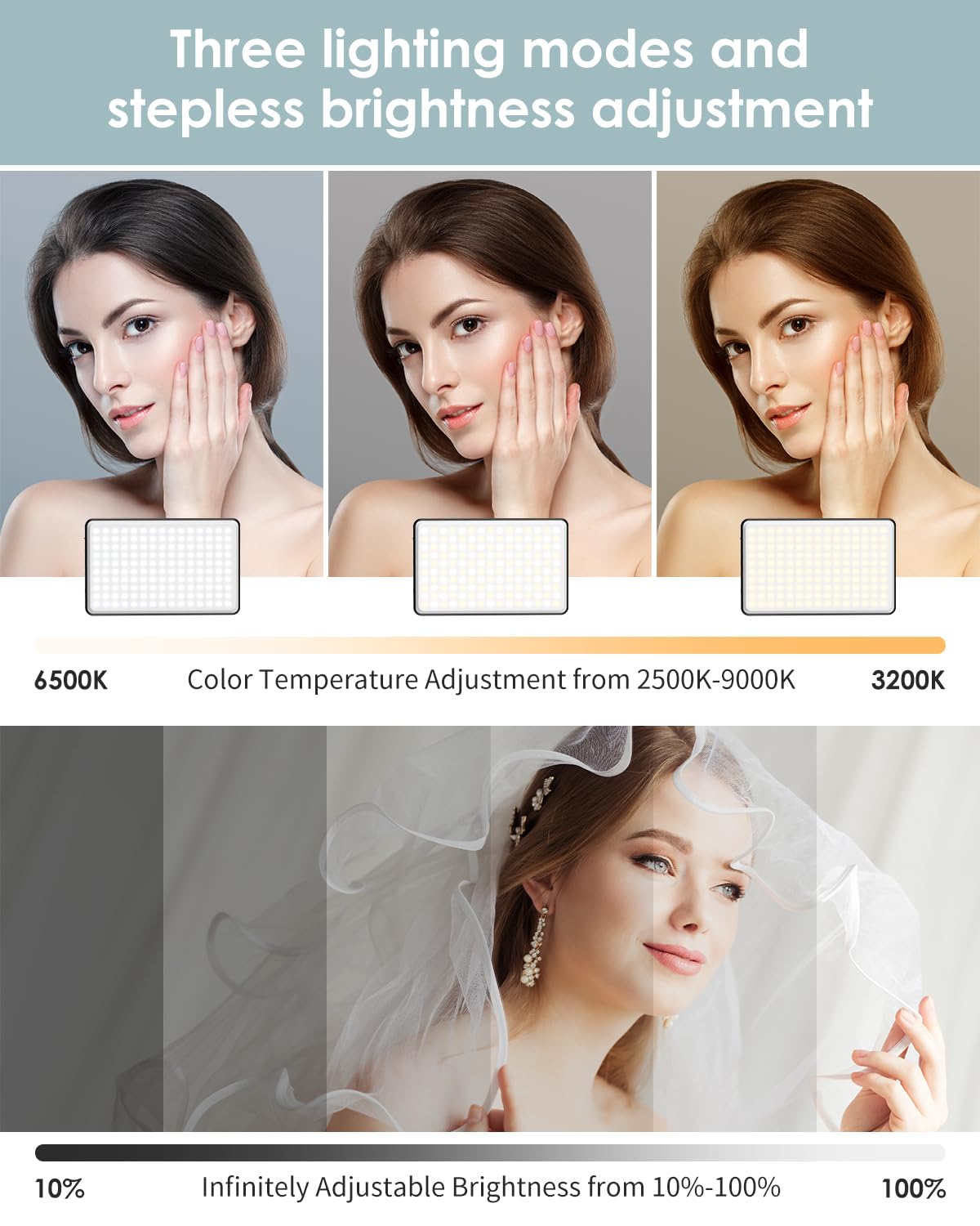 • Different Color Temperature Modes: The selfie light has 3 light modes(cool light, warm light, cold-warm light). The color temperature index of the video light can be adjusted in the range of 2500K ~ 9000K. Whether you prefer warm or cool tones, the different color temperature modes cater to different skin tones. It is suitable for TikTok, video conferencing, selfie, makeup, vlog and live streaming, ensuring that you always look your best for any occasion.