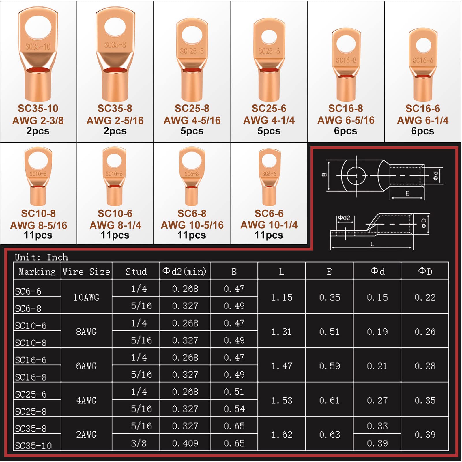• [PREMIUM QUALITY] Heavy-duty battery cable ends are made of good conductive, heat and corrosion resistant purple copper to ensure the reliability of the connection. Surface pickling mitigates oxidation. Standard lugs opening facilitates wire insertion. The inspection window is designed to check the correct and complete cable insertion. Each wire lugs has a specification mark, so you can quickly find the right terminal. Copper wire lugs can be easily and safely crimped or soldered to the cable
