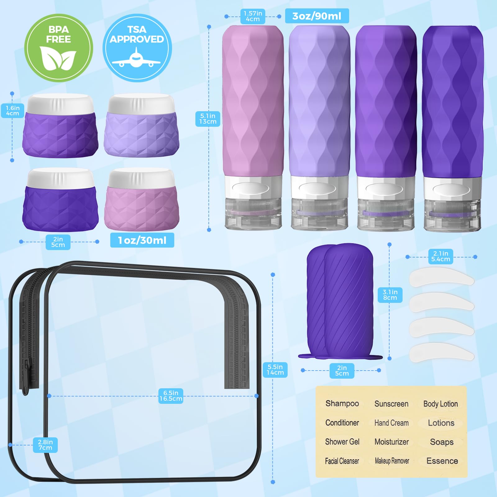 16Pack Travel Bottles for Toiletries, TSA Approved Travel Size Toiletries Containers Set, Silicone Leak Proof Refillable Bottles Elastic Sleeves Creams Jars Accessories Kit W/Clear Bag (Purple)