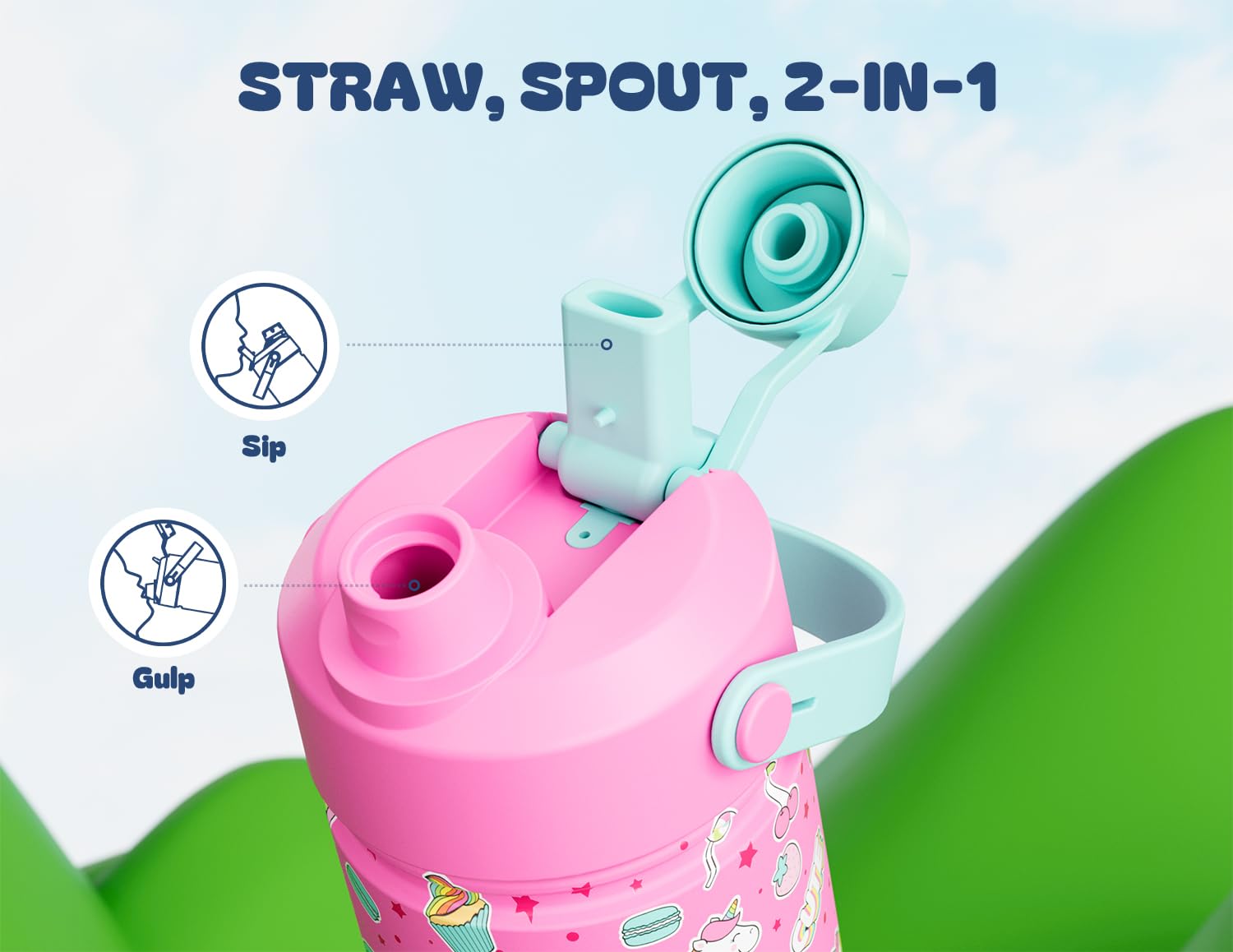 • 2-in-1 Leakproof Lid: Switch between a straw sipping or quick gulping with a leak-proof lid; No spills in backpacks, car seats, or lunchboxes - parents will appreciate the mess-free design.