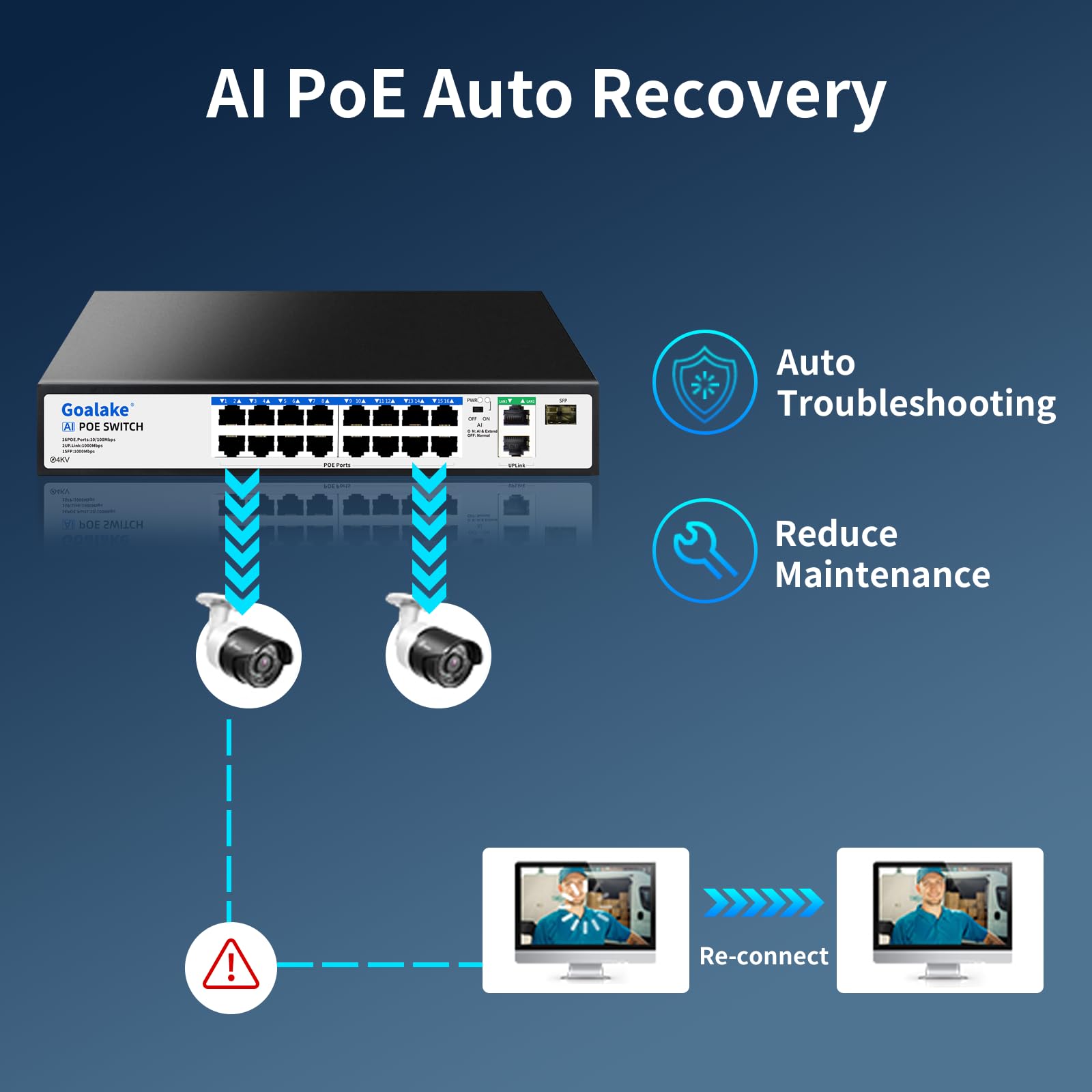 • VLAN & AI Function: The Goalake PoE switch enhances network performance and security. With Vlan, prevent network congestion.The AI extend function allows data and power transmission up to 250 meters, making it ideal for large-scale deployments such as surveillance systems and expansive network setups.