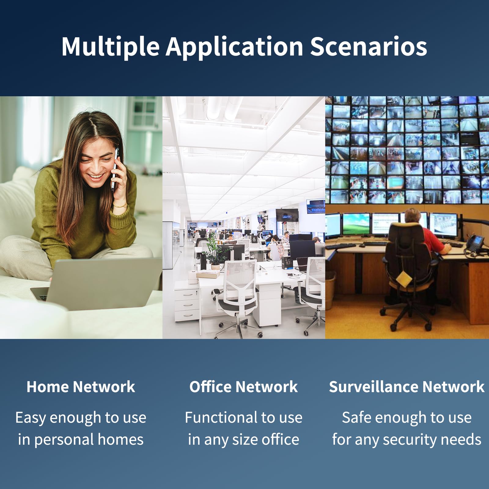 • Reliable and Secure: Our poe switch is equipped with a built-in power supply and 4KV lightning protection, safeguarding your network against power surges and lightning strikes. The fanless design ensures silent operation, while the network cable short-circuit protection, Over Current and Over Voltage portection mechanism protects against faults.