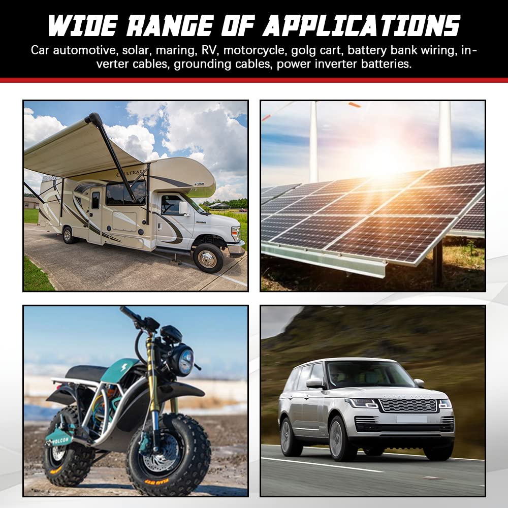 • 【Wide Application】Our positive and negative cables are widely used for car automotive, solar, marine, RV, motorcycle, golf cart, lawn/garden equipment or power inverter batteries, also used for electrical equipment.