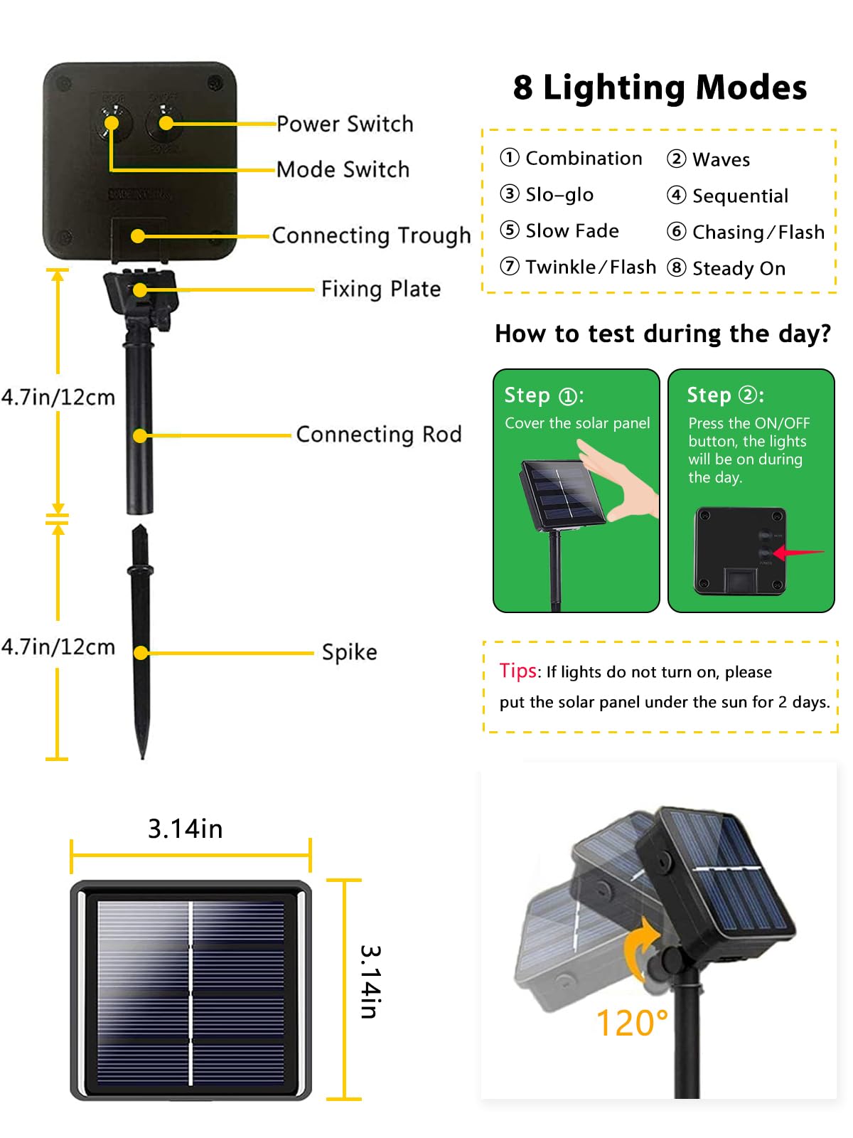 • 2025 New Upgraded Solar Christmas Lights: These solar string lights feature super-bright enhanced LED bulbs and offer 8 versatile lighting modes, a memory function, and auto on/off for effortless operation. With a larger solar panel, they achieve a higher energy conversion rate, while the larger capacity battery ensures extended illumination. Perfect for adding a festive touch, these twinkling lights on a green wire are ideal for decorating your home, yard, or outdoor spaces
