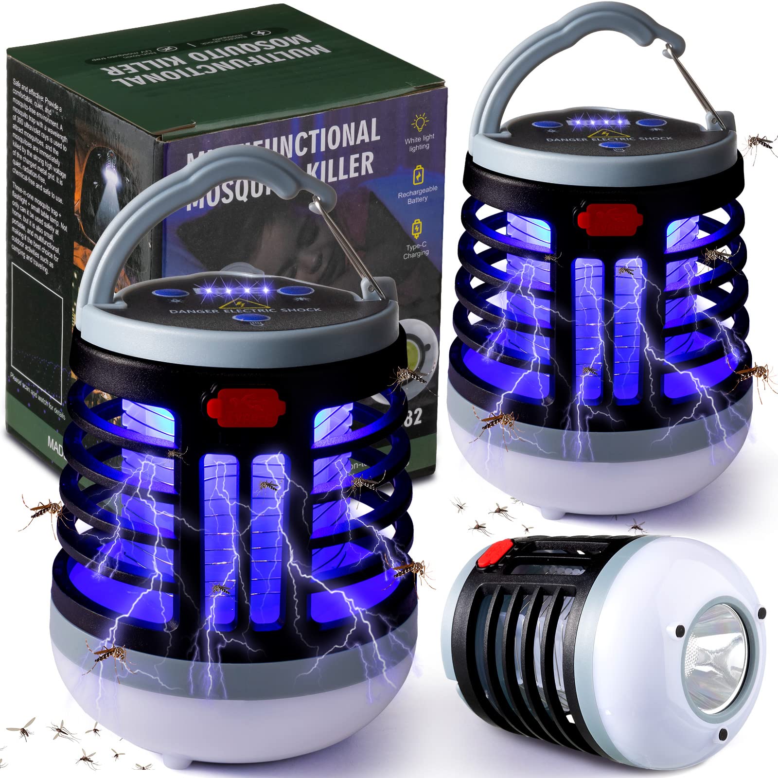 2 Pack 3 in 1 Bug Zapper USB Rechargeable Mosquito Killer Portable Waterproof Mosquito Repellent Outdoor Indoor LED Lantern Bug Zapper Camp Light SOS Emergency Light for Home, Backyard, Patio (Black)