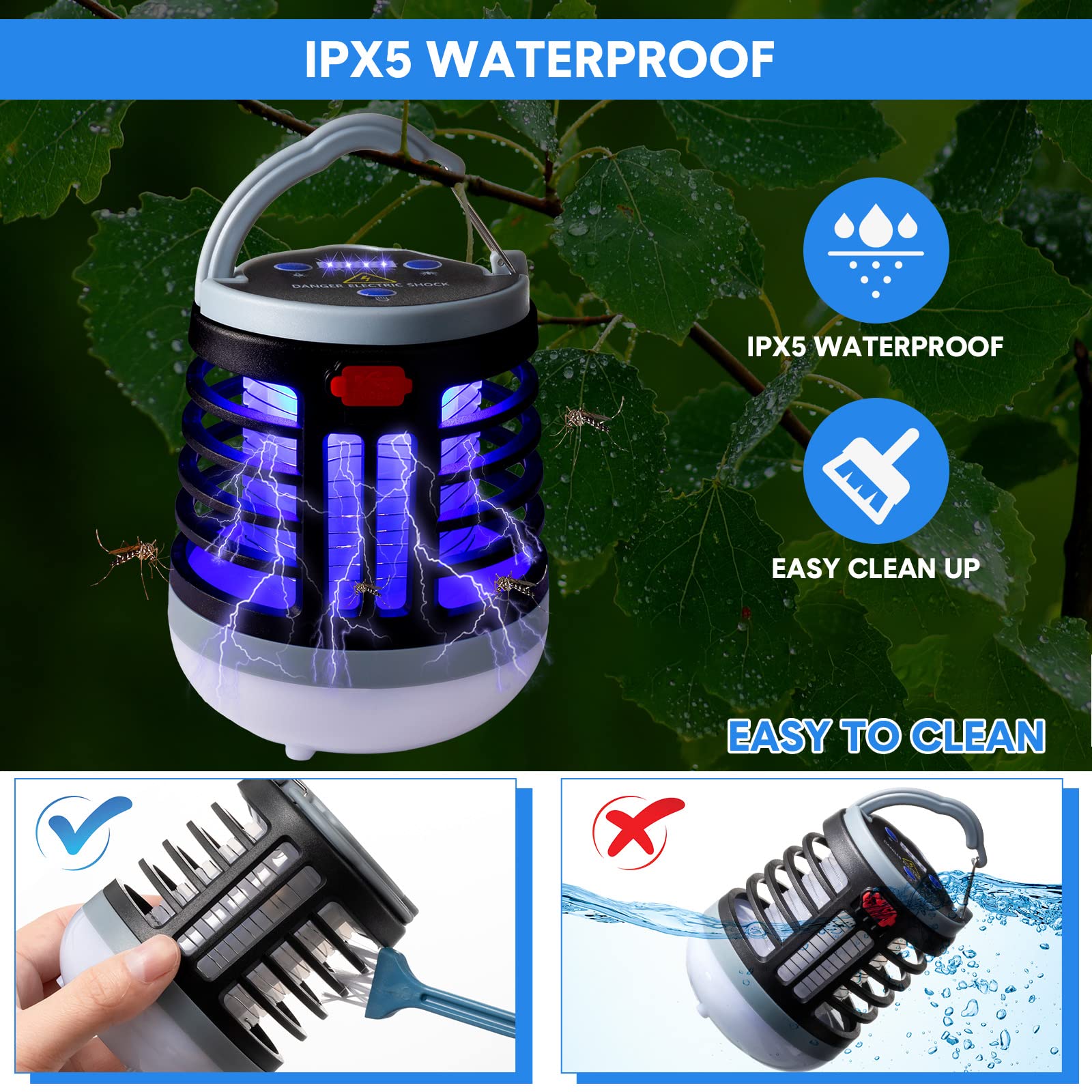 • Waterproof and Easy to Clean: the mosquito repellent adopts IPX5 waterproof design, ideal for outdoor camping without worrying about rainy weather; You can use a small brush to clean the internal grid maintenance as using; Please do not soak the zapper in the water for a long time