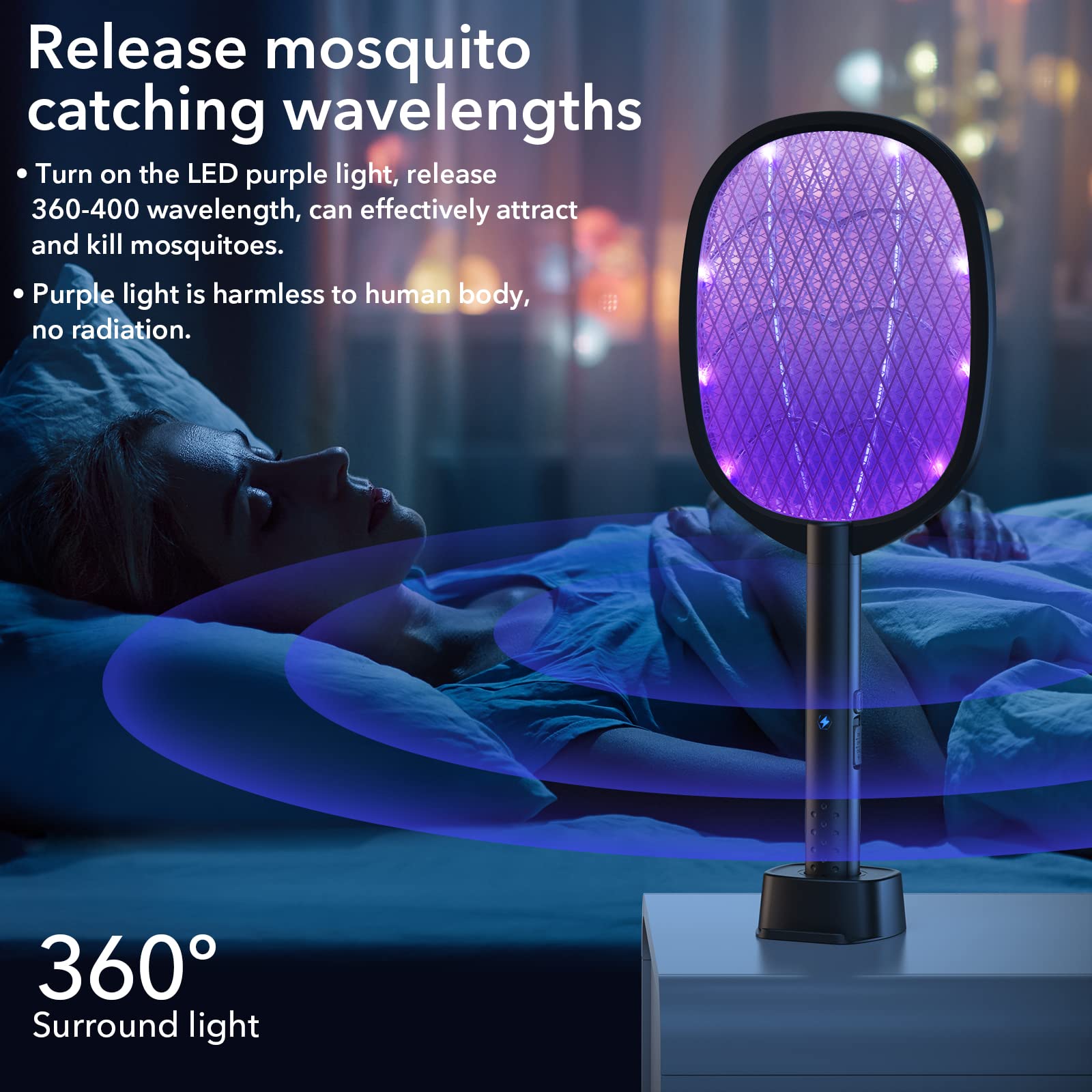 • 【2PACKS 2-in-1 Multifunctional Bug Zapper】: It is not only a mosquito swatter or a mosquito killer lamp, you can wave the electric mosquito zapper with your hand to kill flying mosquitoes and flies. You can also put it directly on the charging base, turn on the ON2 mosquito trap mode, and the mosquitoes will automatically fly to the mosquito swatter and kill them, which will free your hands.01