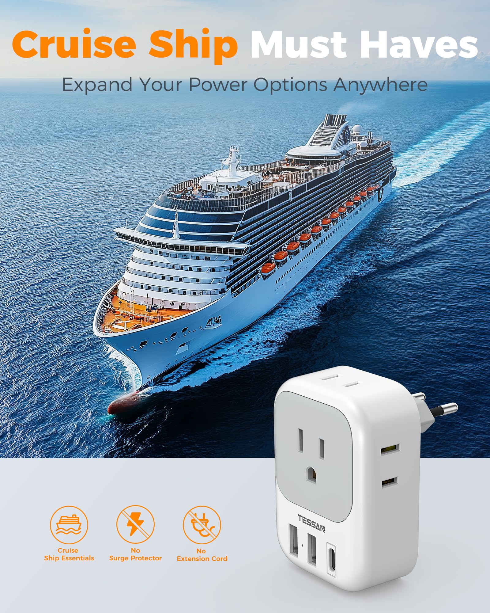 • Compact and Portable: Compact size 2.24 × 3.14 × 2.65 in and lightweight 3.48 ounces; International power adapter fits easily into your bag; EU adapter with 4 sided design won't block when plug in large adapter; No surge protection, cruise ship essentials