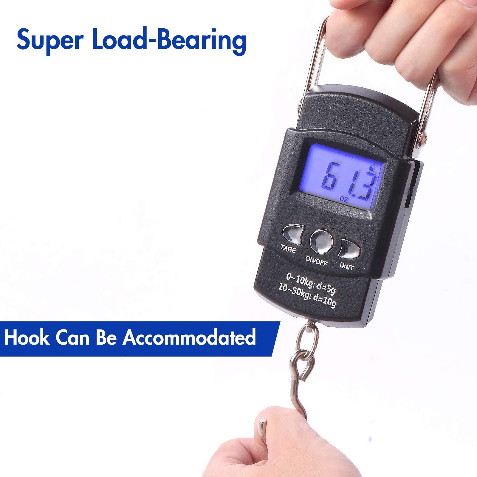 2 Pack Fish Scales, Portable Luggage Weight Scale with Backlit LCD Display 110lb / 50kg Electronic Balance Fishing Postal Hanging Hook Scale with 3.28 ft Measuring Tapes & 4 AAA Batteries (Black)