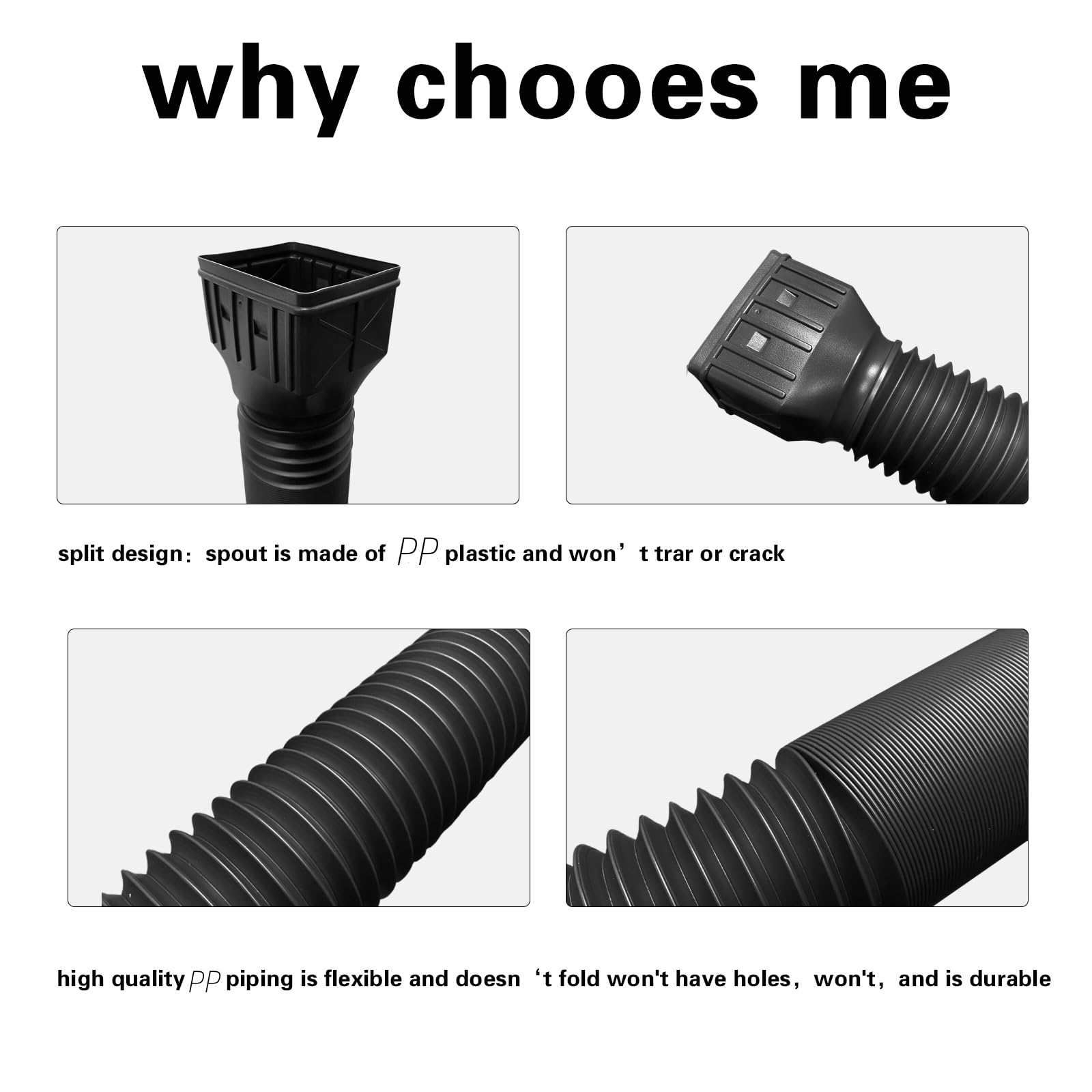• 【 Thickened Material 】This downspout extender is made of PPmaterial,which is tear- and crack-resistant,no creases, no holes and no cracks. Premium construction for durability.