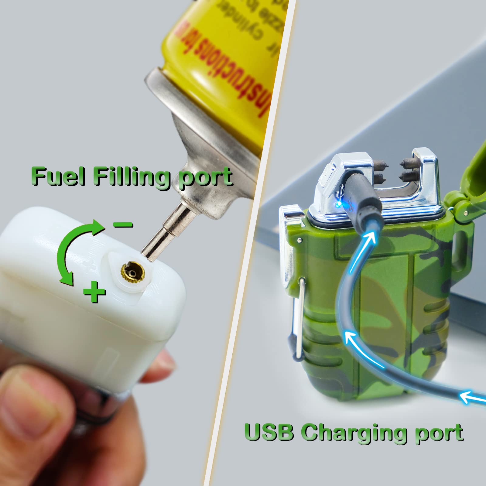 • WATERPROOF & WINDPROOF - These 2 lighters are also built with metal-ring sealed cover and locking clasp. IP56 Waterproof System allows them work well in rainy day and windy day. The arc lighter's flameless design and the blue jet flame lighter both have a function of wind resistance. A necessary tactical gear for the outdoors