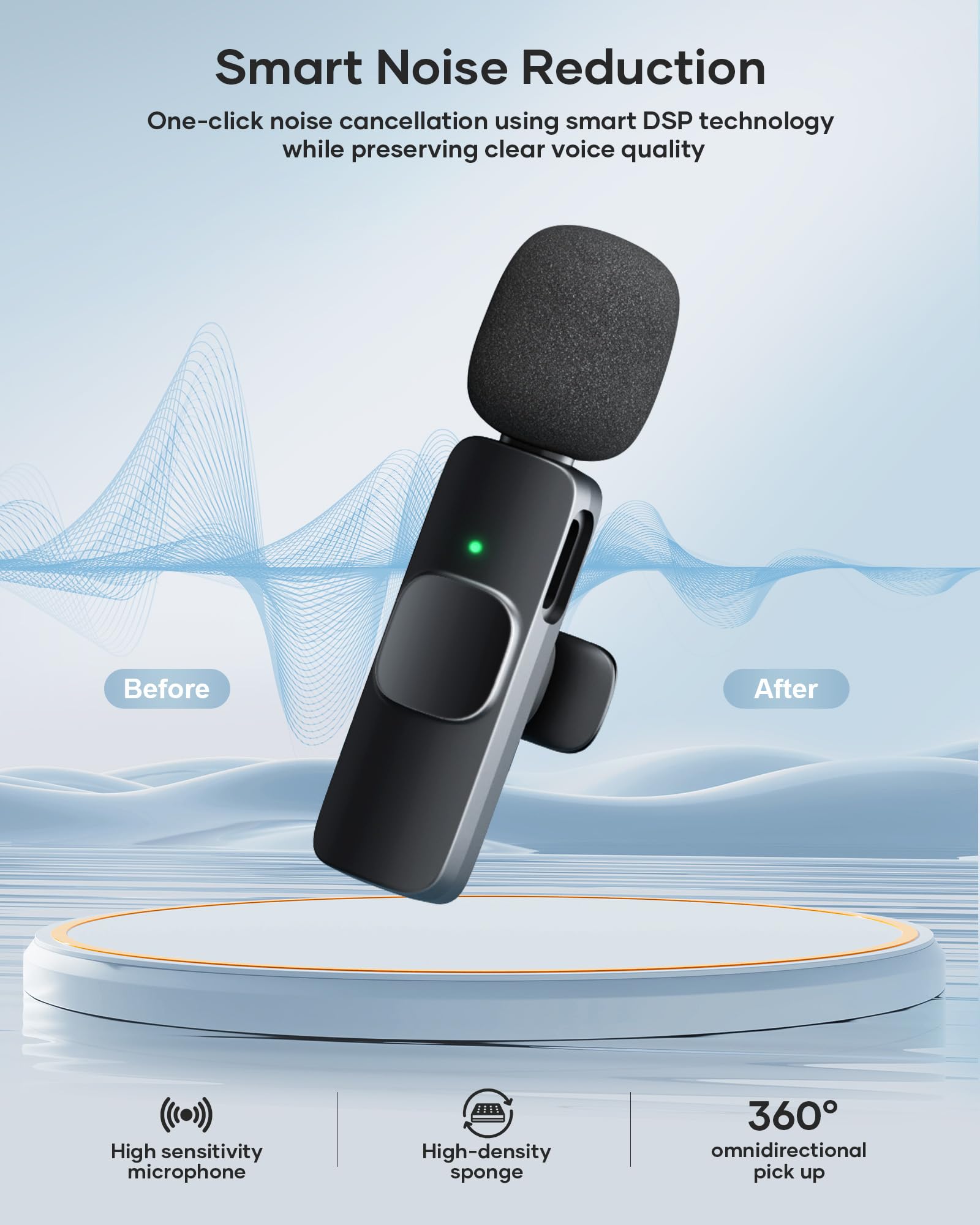 • Plug and Play: This professional wireless lapel microphone is easy to use, requiring no Bluetooth or applications. Simply plug the receiver into your phone and turn on the wireless microphones for automatic pairing. The built-in noise reduction chip effectively reduces low-frequency noise while preserving high-frequency vocals, ensuring clear and pure recording quality.
