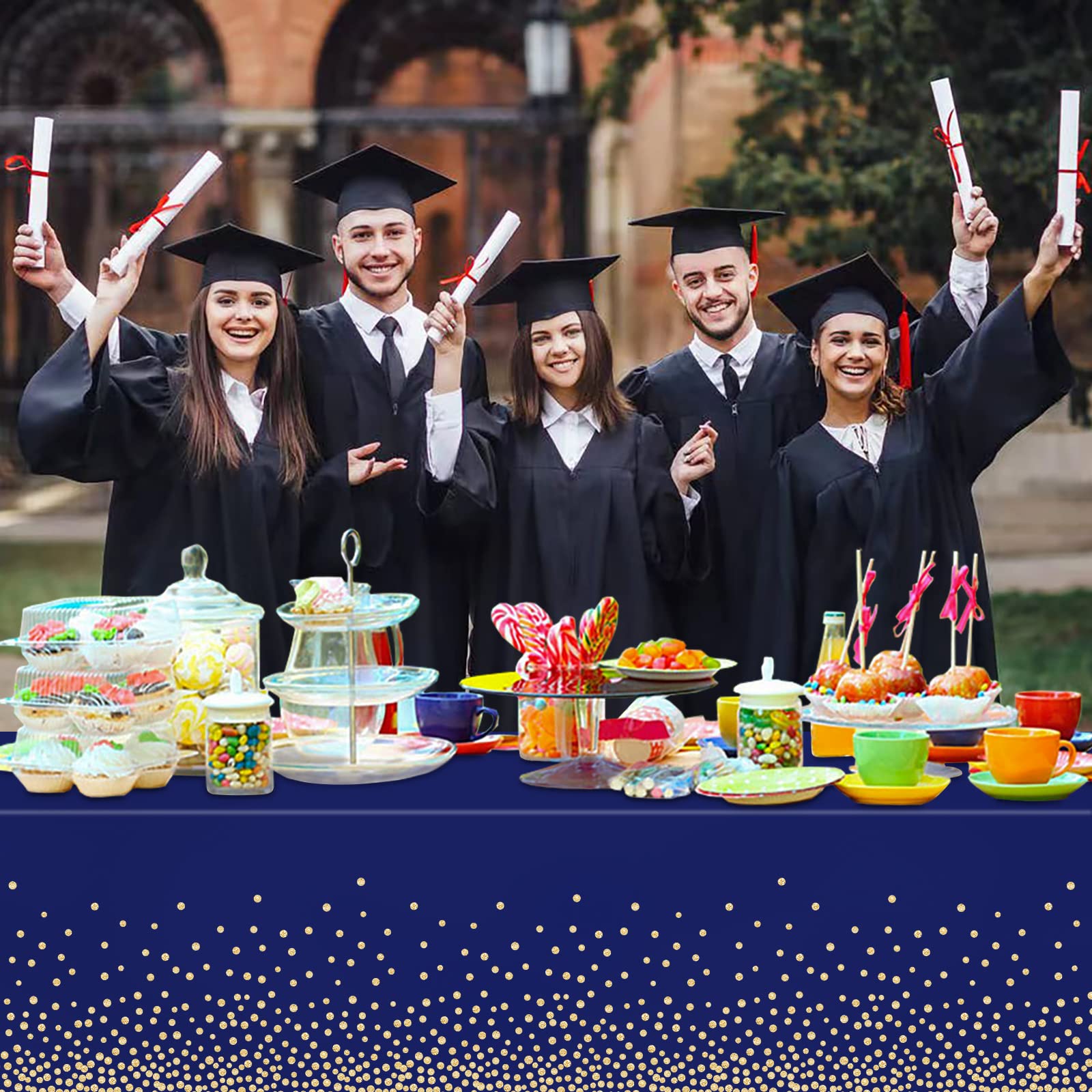 2 Pcs Navy Blue and Gold Plastic Tablecloth for Rectangle Table, 54 × 108 inches Disposable Gold Dot Dark Blue Party Table Covers for Anniversary, Wedding, Fine Dining, Graduation Party Decoration