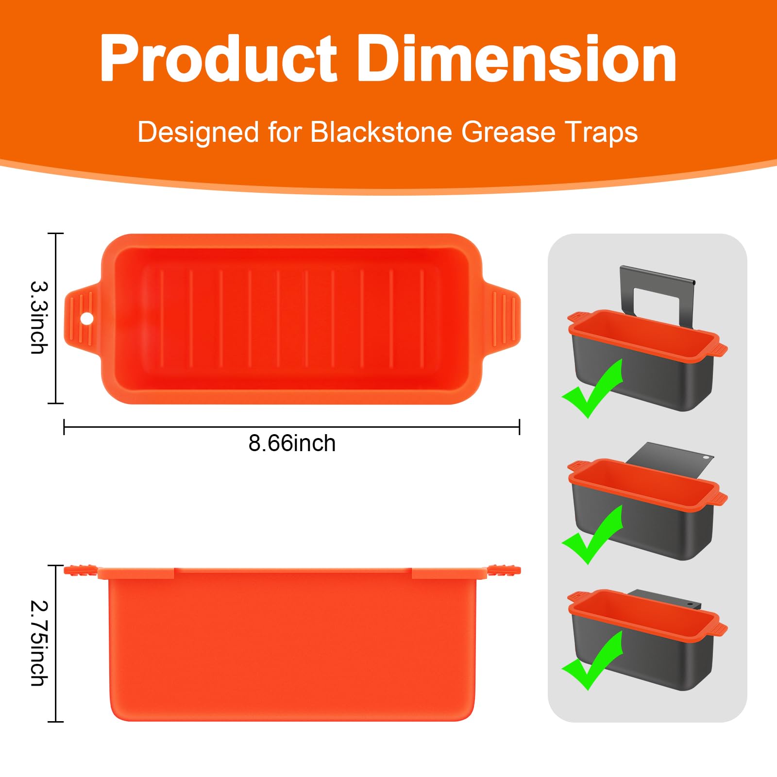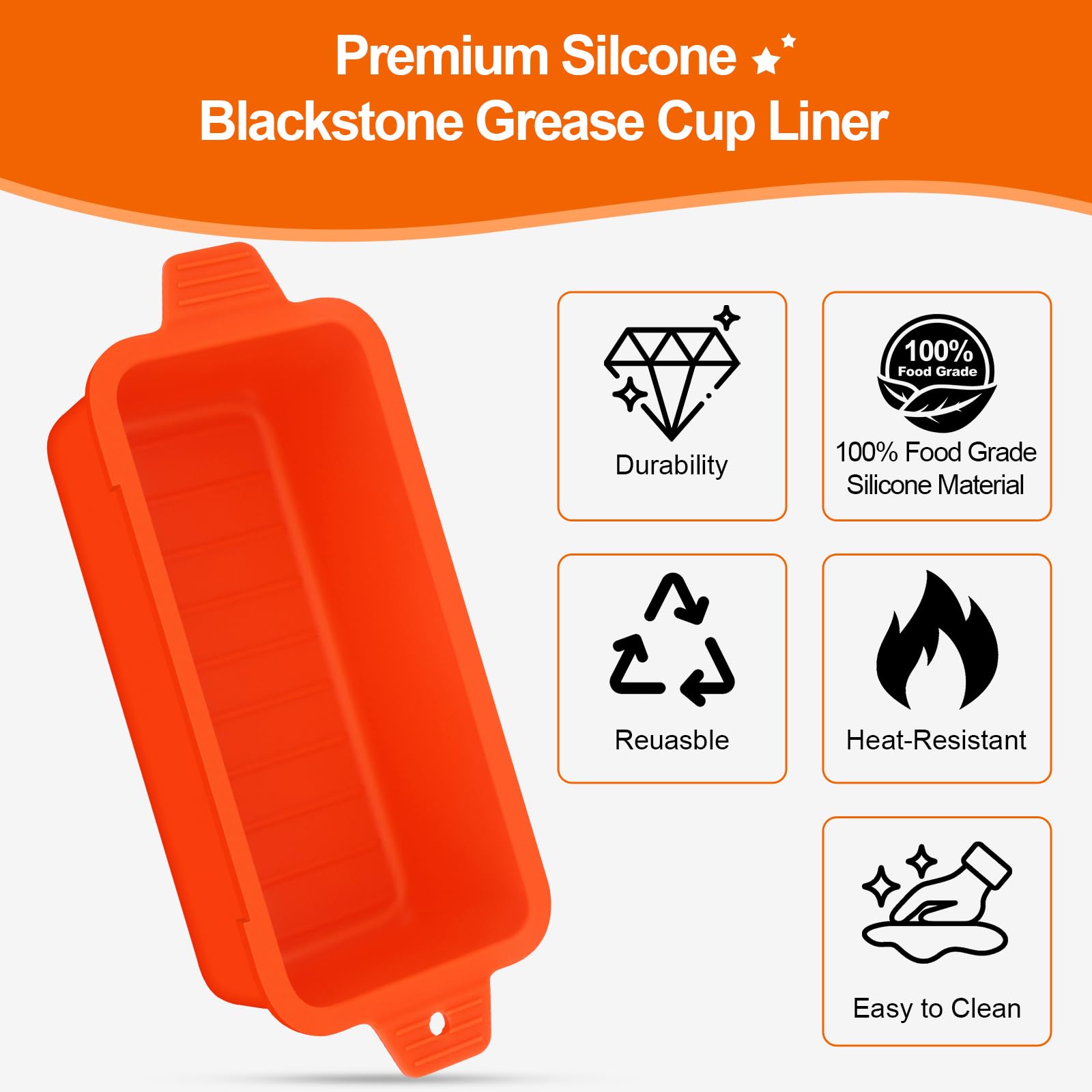 • The Must-have Accessories for Blackstone Griddle: Measuring 7 x 3.3 x 2.8 inches,the silicone grease cups are designed to fit seamlessly on 36/28/22/17 inch Blackstone grills. 2 PCS silicone grease cup liners for blackstone grill. Say goodbye to tedious scrubbing and scraping-these silicone liners make cleaning your griddle effortless,ensuring a more enjoyable cooking/grilling experience every time.