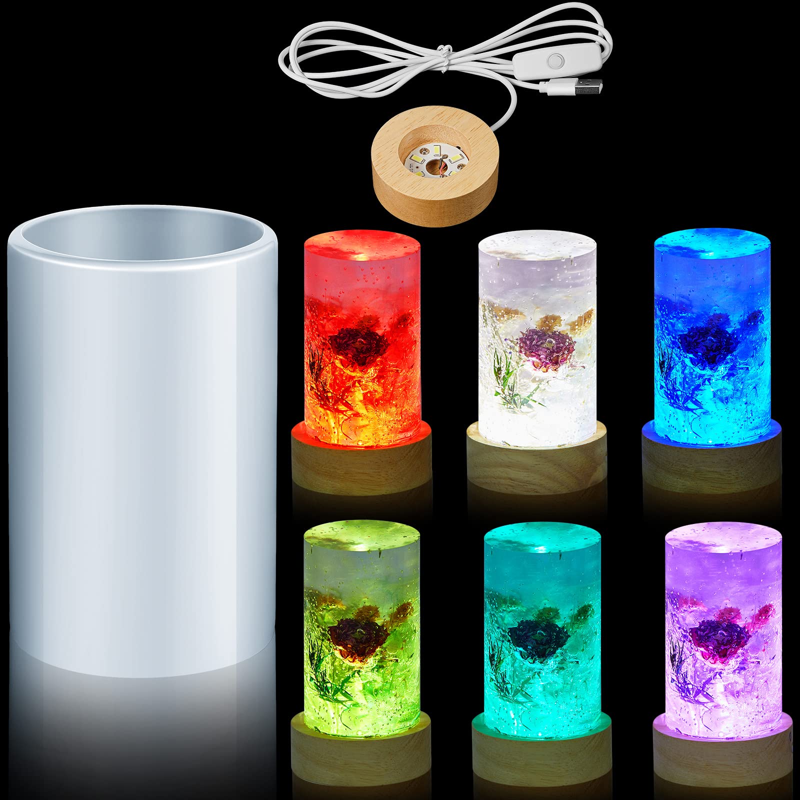 2 Pieces Cylinder Light Resin Silicone Mold Set, Include Cylinder Light Resin Mould and USB Powered Wooden Lighted Base Stand for DIY Desktop Ornaments Table Lamp Table Candle Home Decorations