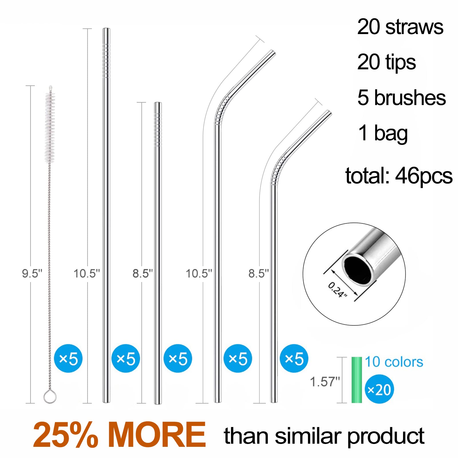 • VARIOUS LENGTH AND WIDE APPLICATION: The various length give you many different cup options. you could use 10 pcs ultra long 10.5 inch straight and bent straws for 24 oz,30 oz,32 oz and 34 oz tumblers, 10 pcs regular size 8.5 inch straight and curved straws for 16 oz and 20 oz mugs or water bottles. These long metal straws are perfect for drinking cold beverage,cocktail,coffee,iced tea,soda etc.