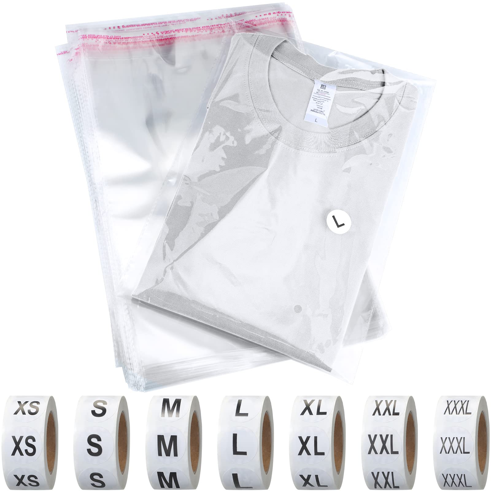 • Self Sealing: By peeling and removing the adhesive strip, the clear bags become sealable in seconds. Our resealable adhesive allows you to easily reseal any opened clear sleeves. shirt size stickers and polypropylene bags are made of quality materials, and it's easy for you to peel off the size stickers and seal the bag;