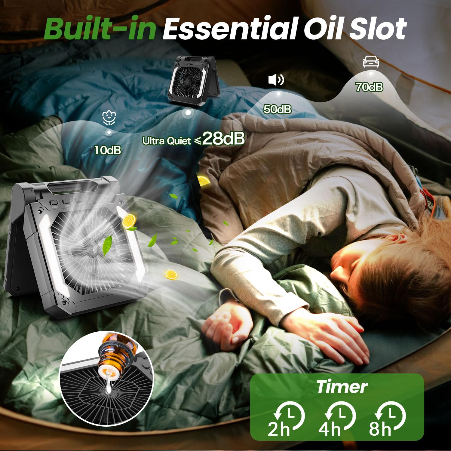 • 【Built-in Aromatherapy & Hang Hook Fan】A unique air freshner slot located at the front of the fan. Just simply insert a scent pad into the container and add your favorite essential oil for a fresher breeze. This cordless fan can be 90° fold to stand as table fan, but also its rotatable hook, makes it easy for improving air flow inside camper tent, van, rv or small room at circulating air.
