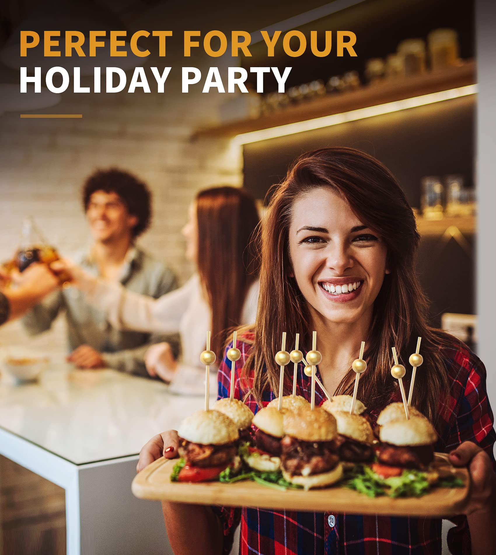 200PCS Cocktail Picks, Fancy Toothpicks for Appetizers, Decorative Bamboo Skewers for Appetizers Drinks Fruit, 4.7 Inch Long Wooden Gold Pearl Food Sticks Charcuterie Boards Accessories Party Supplies