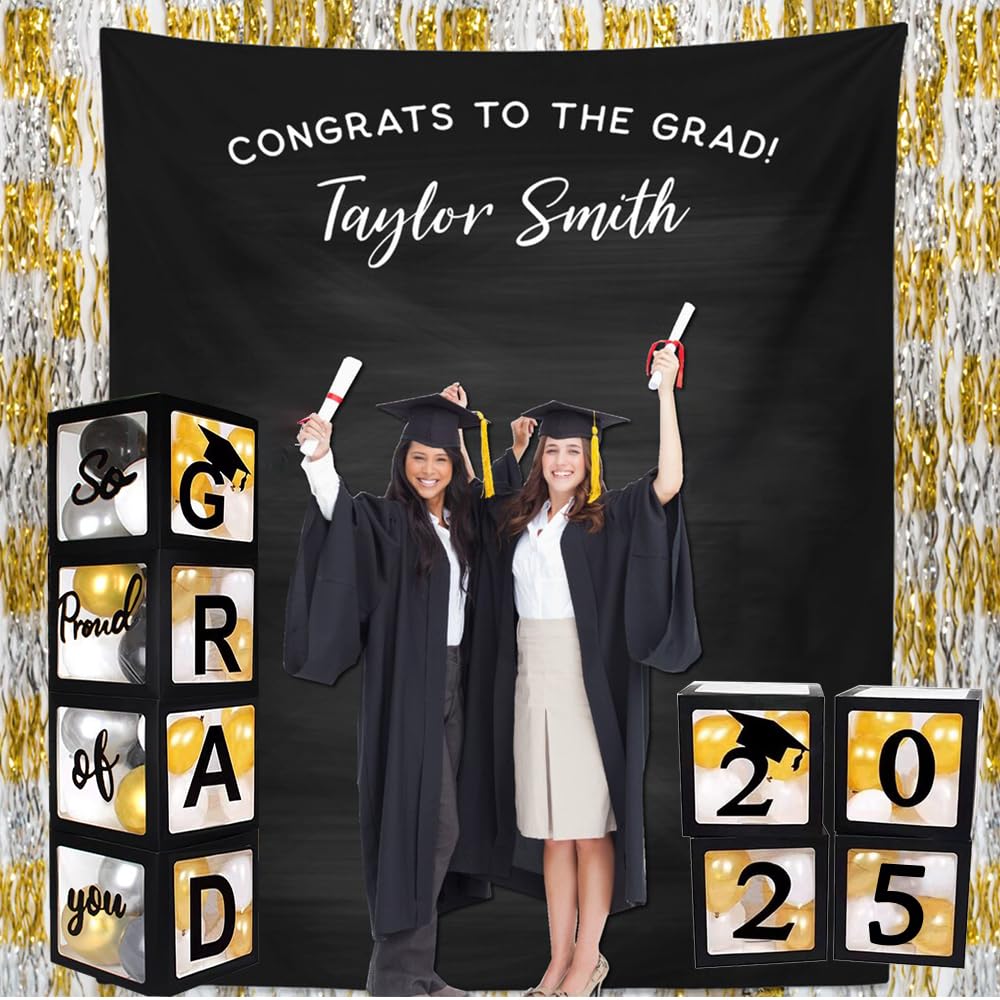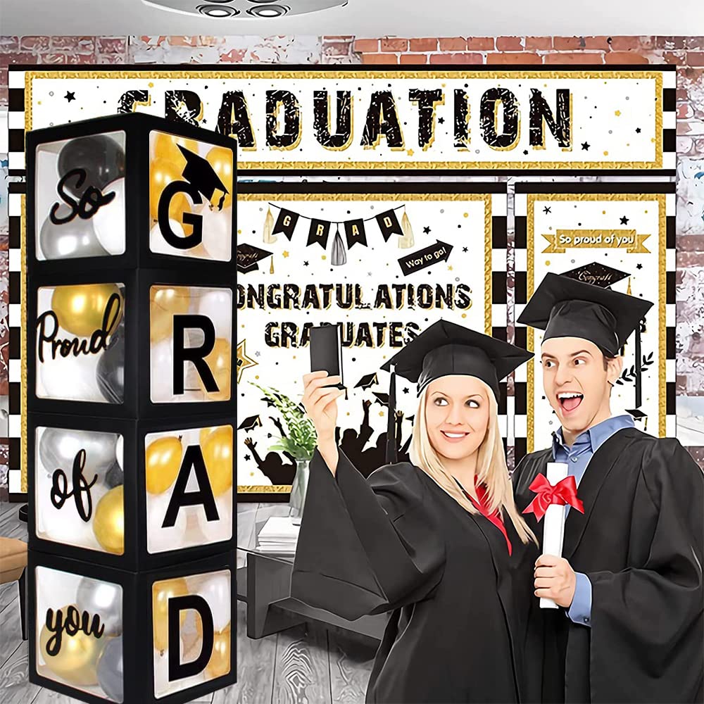 Details: 2025 Graduation Party Decoration Black Balloon Boxes with Letters 2025 Grad & So Proud of You and 20 pcs Ballons