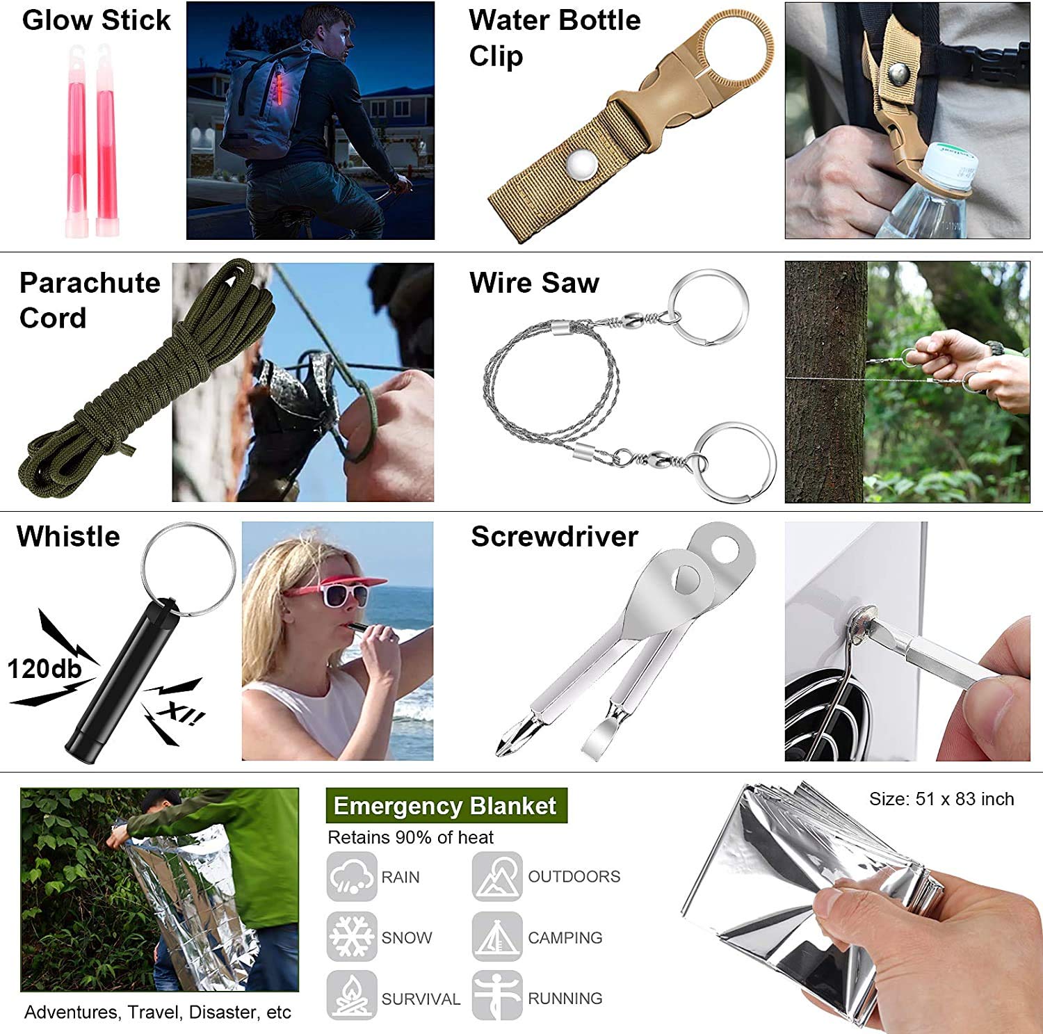 2.【Multipurpose Survival Gear and Equipment】This is a professional emergency kit, it contains various practical survival tools : survival bracelet , multifunctional card, wire saw, 7 in 1 spoon and fork, glow stick, flashlight, emergency blanket, fire starter, bottle hanging buckle, parachute cord, whistle, screw driver, fishing kit, meet your different emergency needs outdoor. Perfect gifts for men women like camping hiking backpacking, fishing, and other outdoor activities.
