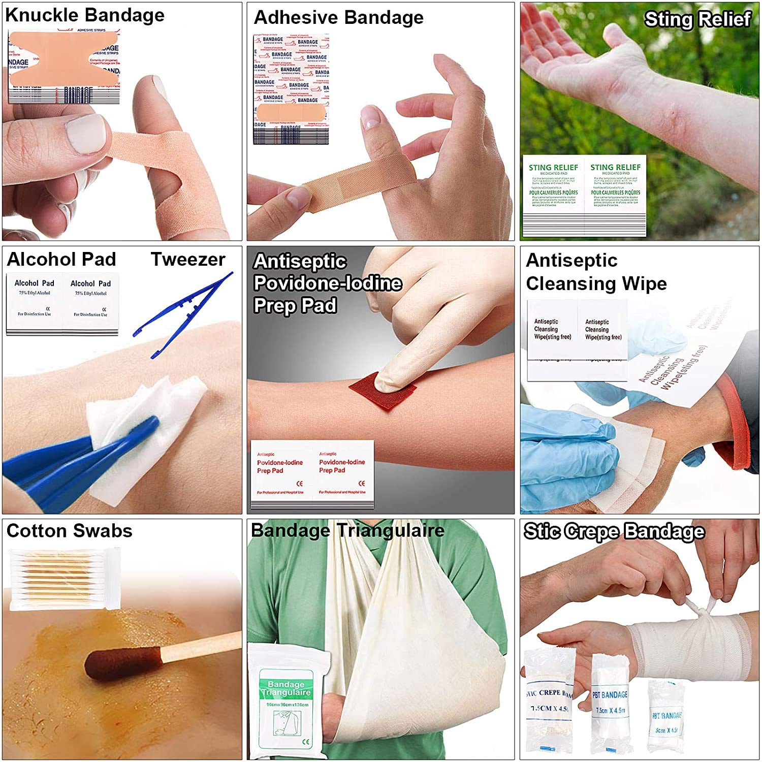 3.【Essential First Aid Supplies】Our emergency trauma kit contains 180pcs essential first aid supplies like bandage triangulaire, bandage, PBT bandage, non-woven medical tape, ice pack, CPR mask, sting relief prep pad, antiseptic cleansing wipe, cotton sticks, tweezers, scissor, etc. Perfect for taking care of any medical needs during outdoor wilderness adventures. It’s a must-having emergency preparedness for car, home, workplace.