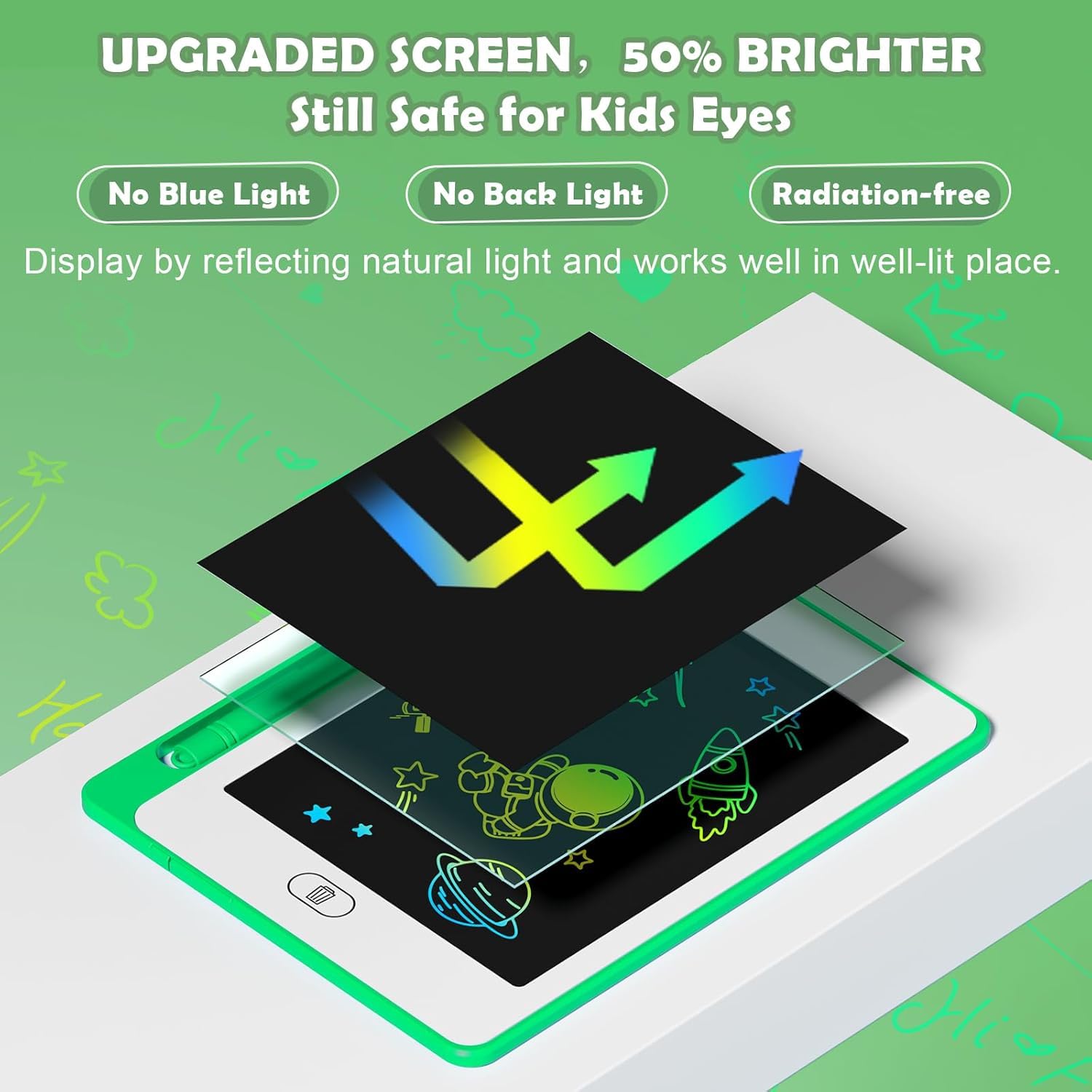 • 6.5 Inch Eye Protection & Colorful Lcd writing Tablet: OMXDG kids LCD doodle board is a creative education and learning toy, perfect support for drawing, writing, spelling, math, remark, and notes which can let your kids freely release their natural instincts. With erase button on the front and lock switch. You can draw and erase easily by pressing the button on the front of the board. The pen fits snug on top of tablet and it will not come loose.