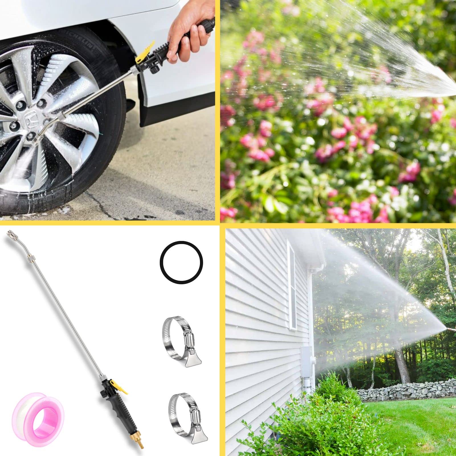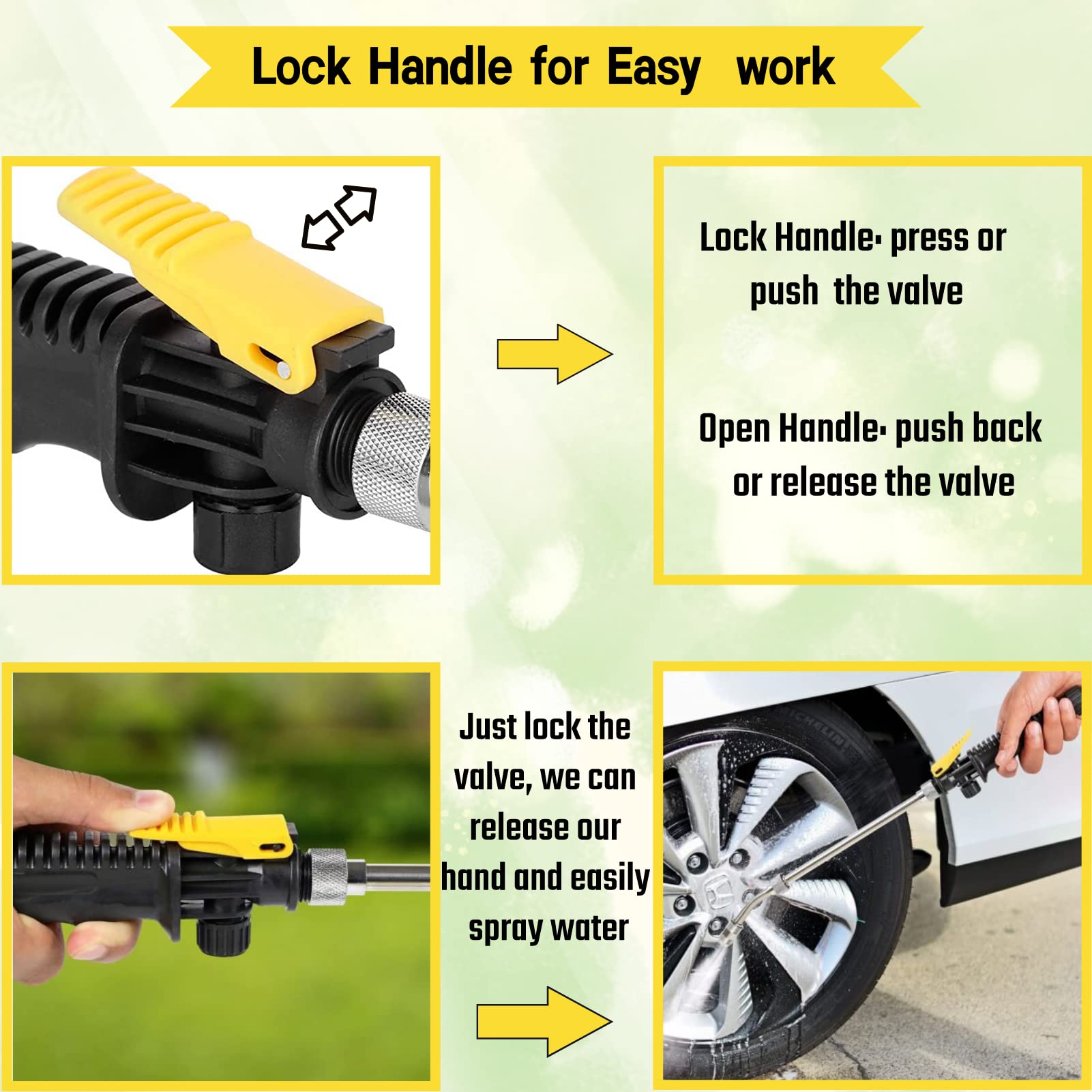 • Freely Adjustable: Stainless sprayer wand with an adjustable nozzle; Turning nozzle to get a strong stream or a fine spray; Handle has a lockable valve so you can lock it to work continuously and relax your hands; Besides, you can Adjust this spray wand to a length you want