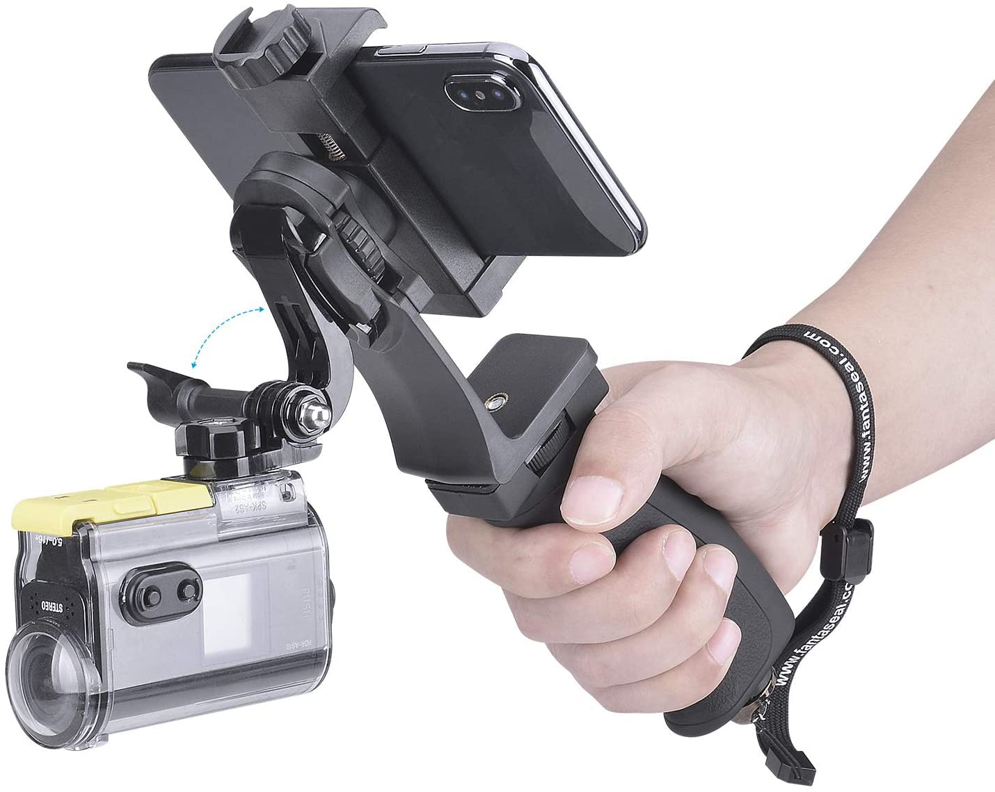 2in1 Ergonomic Portable Action Camera+Smartphone SYN Hand Grip Stabilizer Combo Mount Video Vlogging Rig Holder Kit for GoPro iPhone Interview Travel YouTube Tiktok Streaming-Mic+Light Adapter