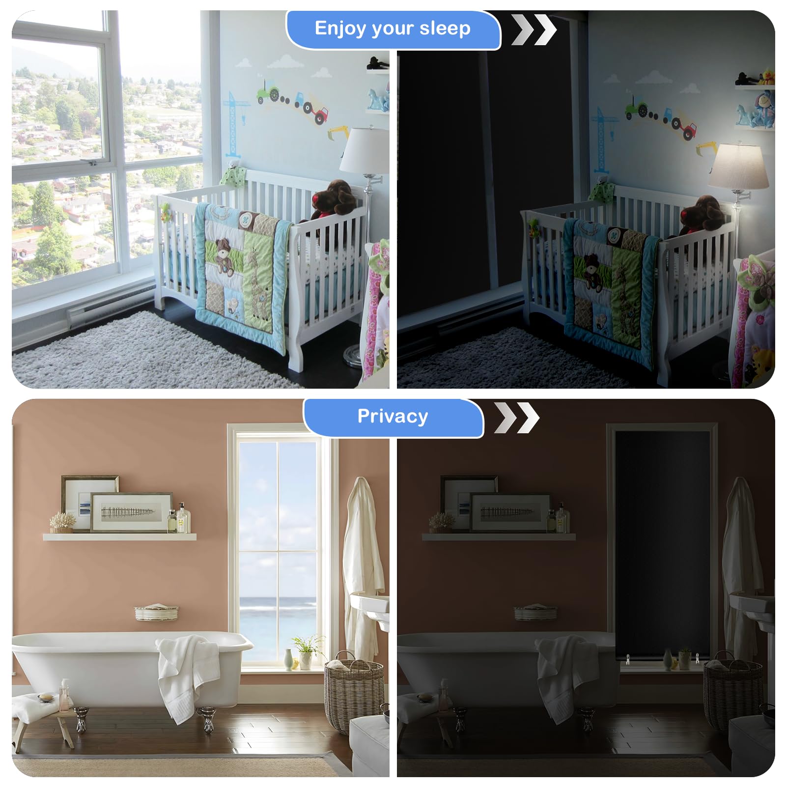 • Multi Scenario Application:Blackout shades has multiple protection functions,can be used in the bedroom to improve sleep quality,used in the home theater to improve the atmosphere and viewing effect,can also be used in the RV,classroom,office,freely adjust the feeling you want