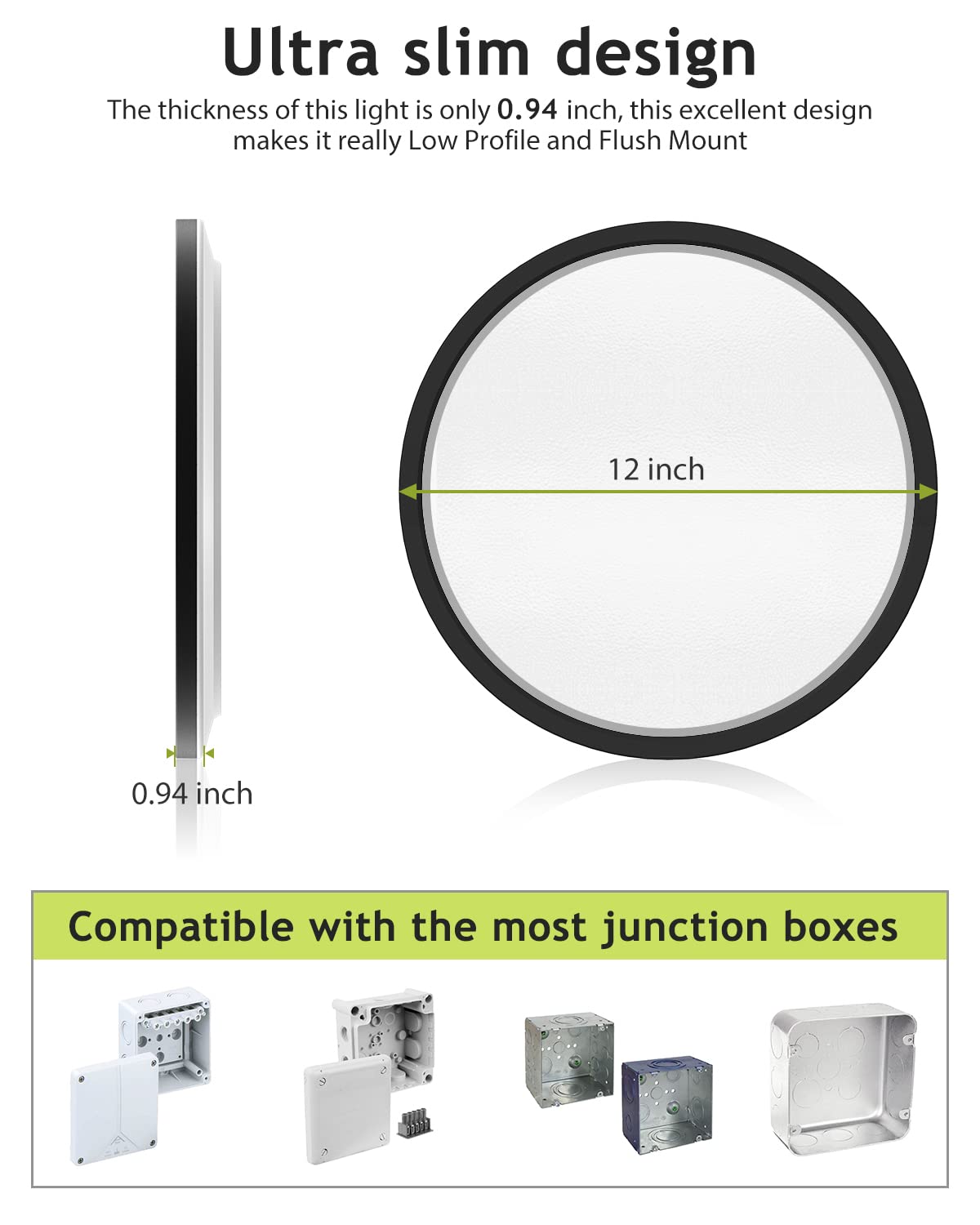 2PACK Flush Mount LED Ceiling Light Fixture Black, 12Inch 28Watt, Dimmable & 3000K-4500K-6000K 3 Color Selectable Ceiling Lamp 3200LM Low Profile Ceiling Light for Kitchen Bedroom Hallway Porch