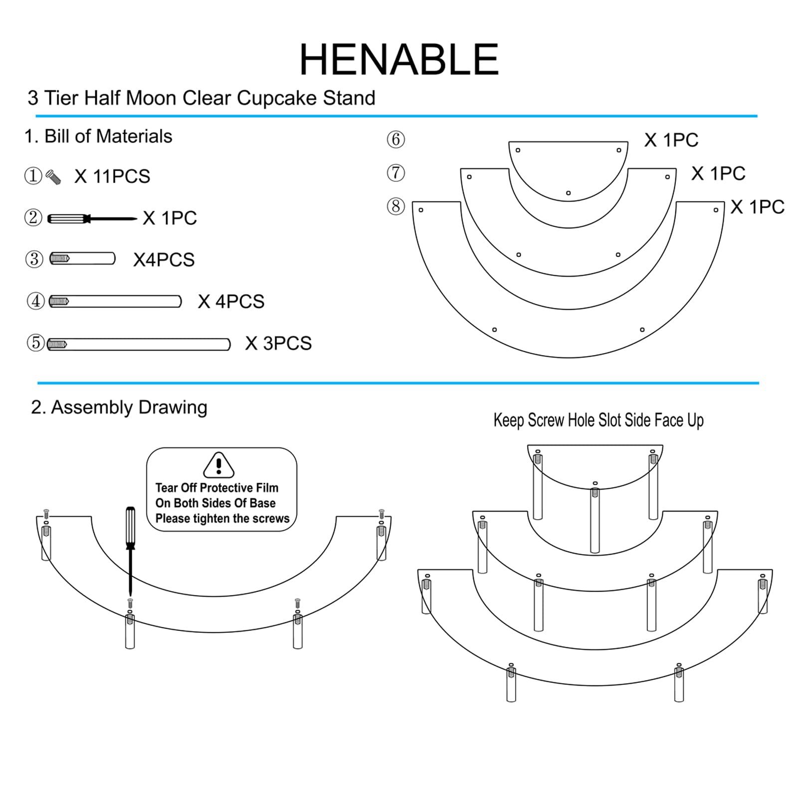 • What You Get: Acrylic half-moon dessert stand include 2 X 3-tier display stand, 1 X Phillips Screwdriver, 1 X Specification