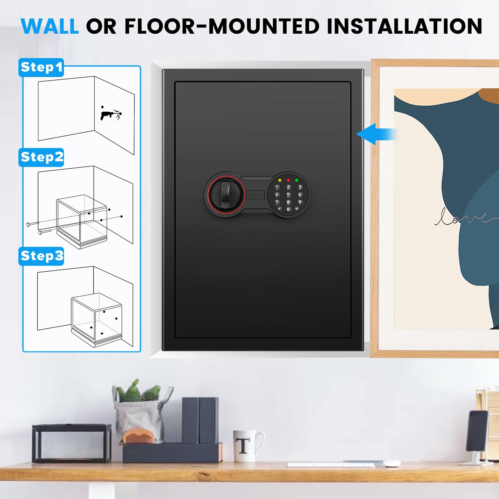 • ANTI-THEFT ALARM & ANCHORING DESIGN: Our large safe comes with a dual alarm system to prevent password guessing and effectively deter unauthorized access. Enter the wrong password 3 times in a row will activate the alarm system and the safe will lock for 20 seconds. Anchoring design makes you easily fix the safe to the wall or floor, improving safety and reliability