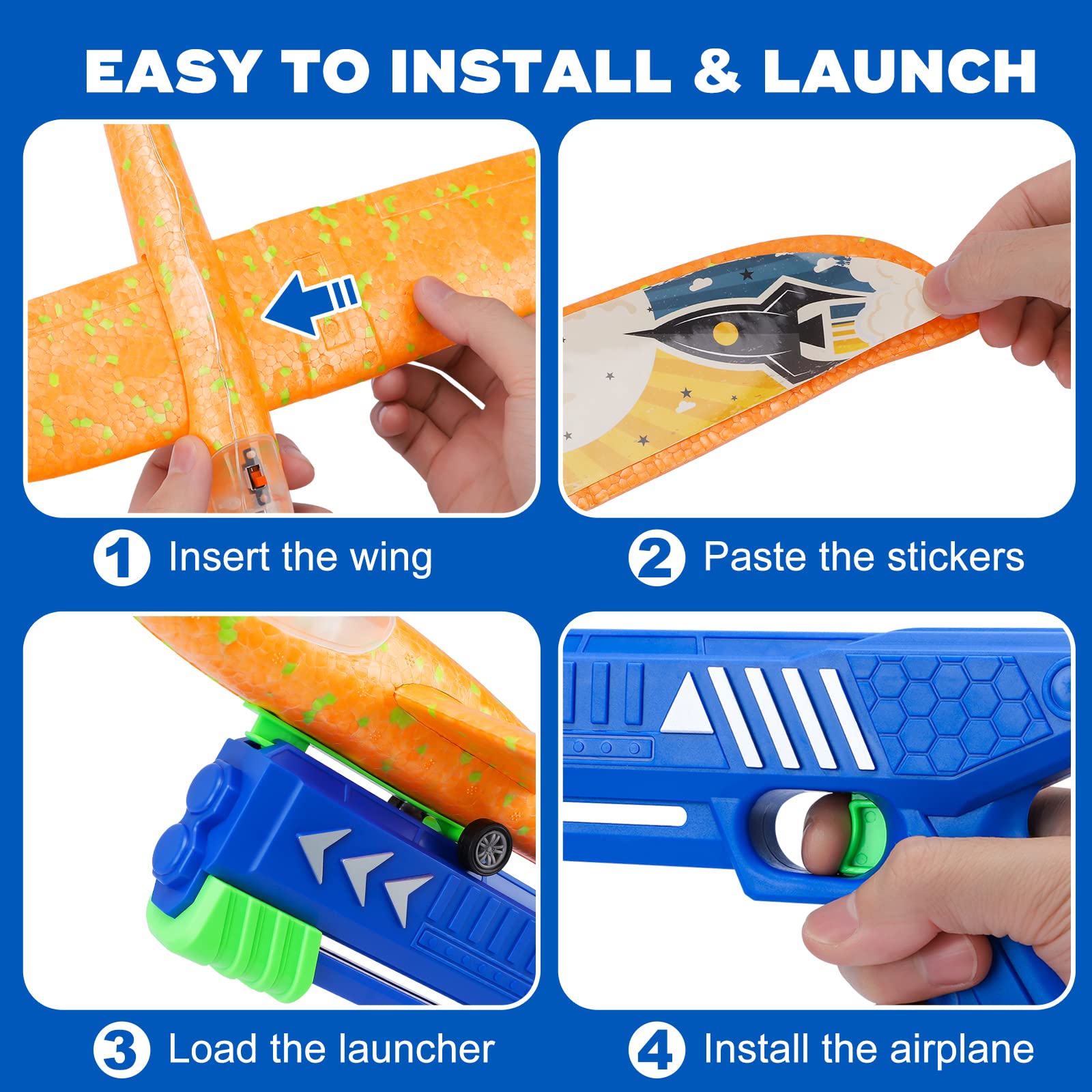 • Gifts for boys girls: Package included: 1 x Launcher; 3 x LED Foam Airplanes; 3 x Stickers Theme of Rocket; Dinosaur; UFO; 1 x Use Manual. Perfect gift for kids 3 4 5 6 7 8 9 10 11 12 years old for birthday; Easter; Children's day; Halloween, Christmas