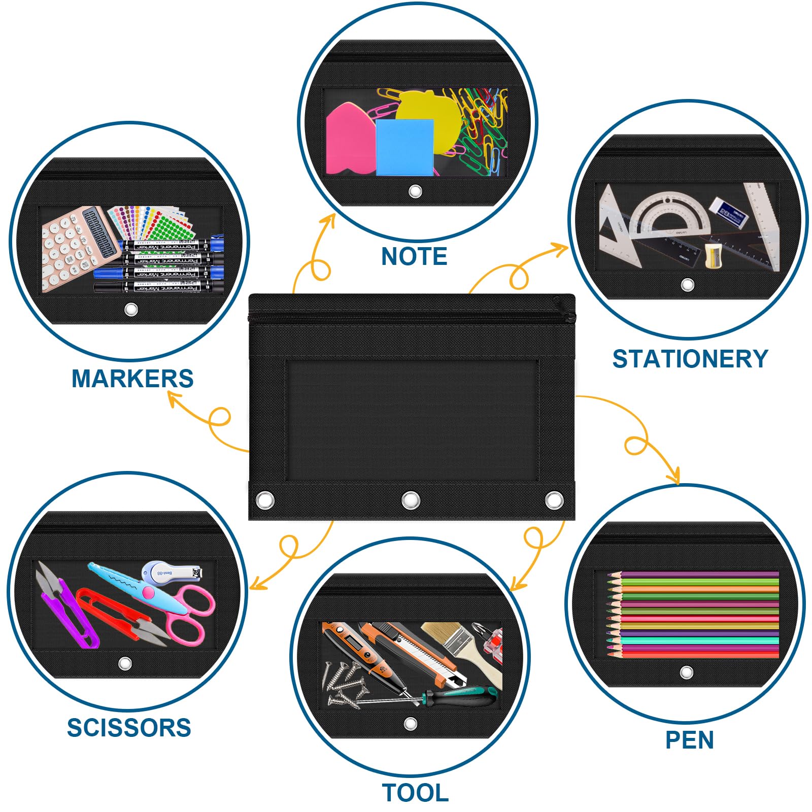 • High-Quality Material - The binder pockets are well made with high-quality 600D Oxford fabric, durable and reusable. 3 metal rings made of thick material and rivet-reinforced ring holes, to keep the product lasting a long time. The metal zipper glides smoothly, never worrying about getting stuck, zipper pencil pouches have thick clear PVC plastic that can prevent it from being pierced by a pen tip or scissors.