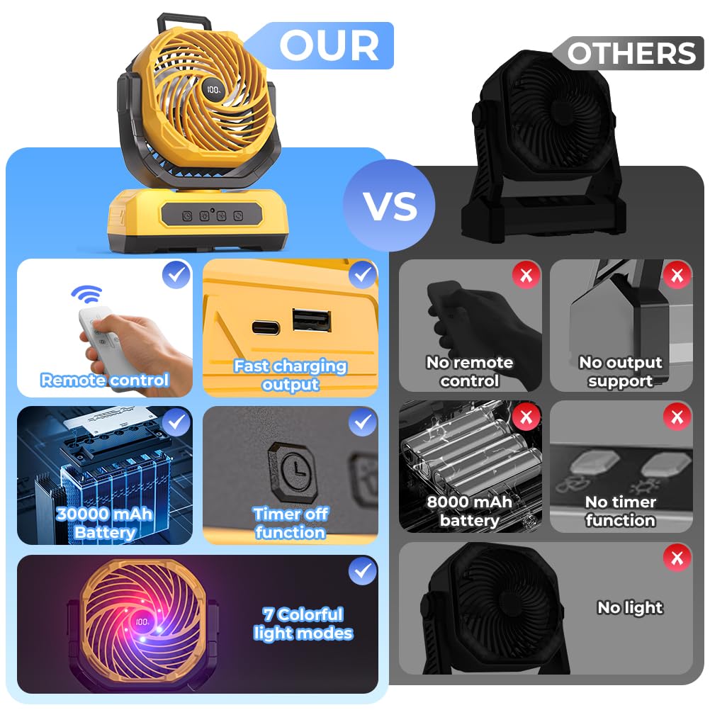 • 【30,000mAh Battery - Extra Long Life】The camping fan is equipped with a high-capacity battery, strong wind power to bring 24-80 hours of long-lasting coolness. Meanwhile, it can be used as an emergency power supply, supporting Type-C fast charging for cell phones and other devices. Intelligent digital display screen real-time display of power and wind speed, outdoor power at a glance.