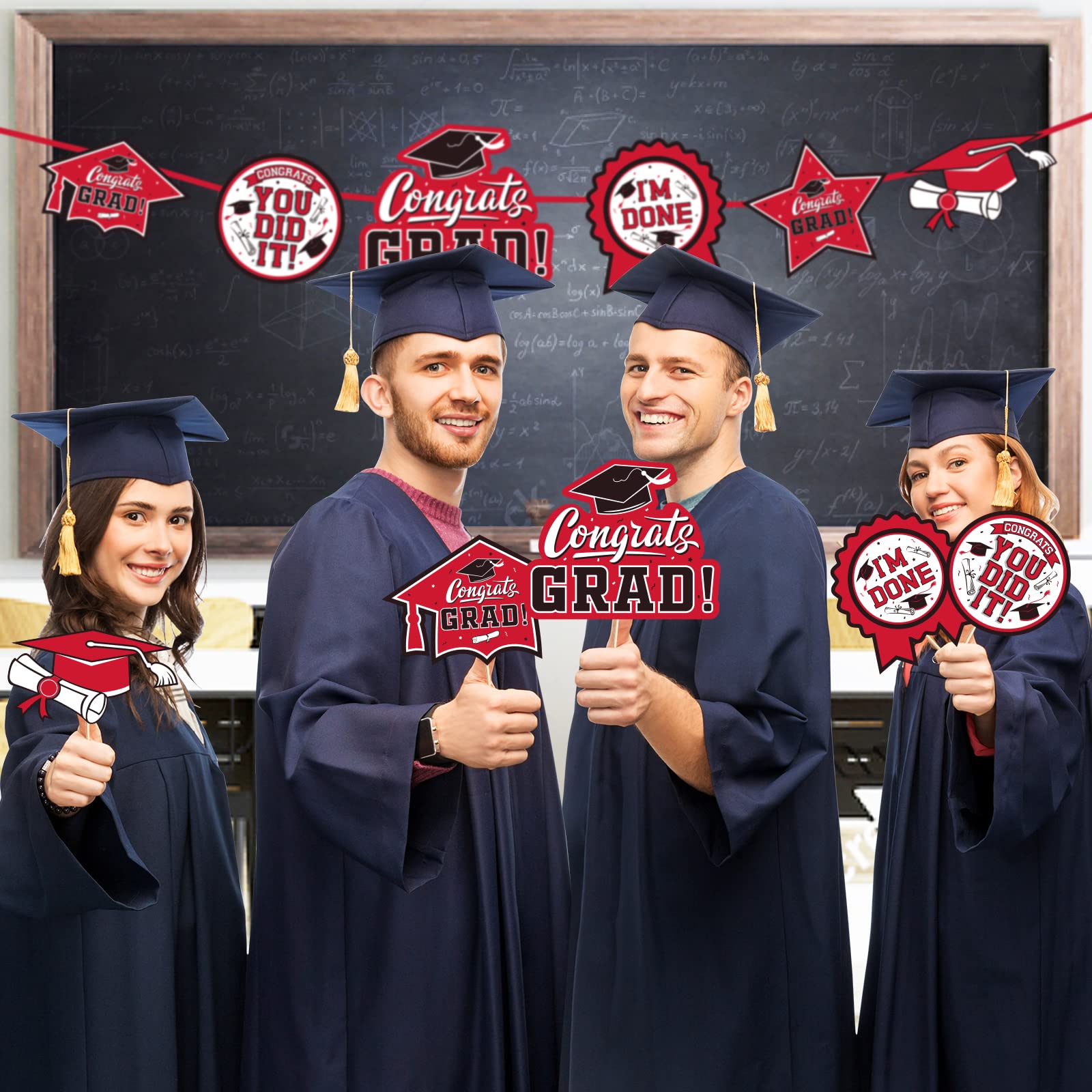 • Red & Black Graduation Party Centerpiece Sticks:The package of 2024 Graduation Party Centerpiece Sticks comes with 30 pieces of double-sided printed cards, featuring 6 different graduation shapes in Red and black. Also included are 30 wooden dowel sticks and 60 non-trace glue points for easy assembly, which makes it convenient for your decoration needs.