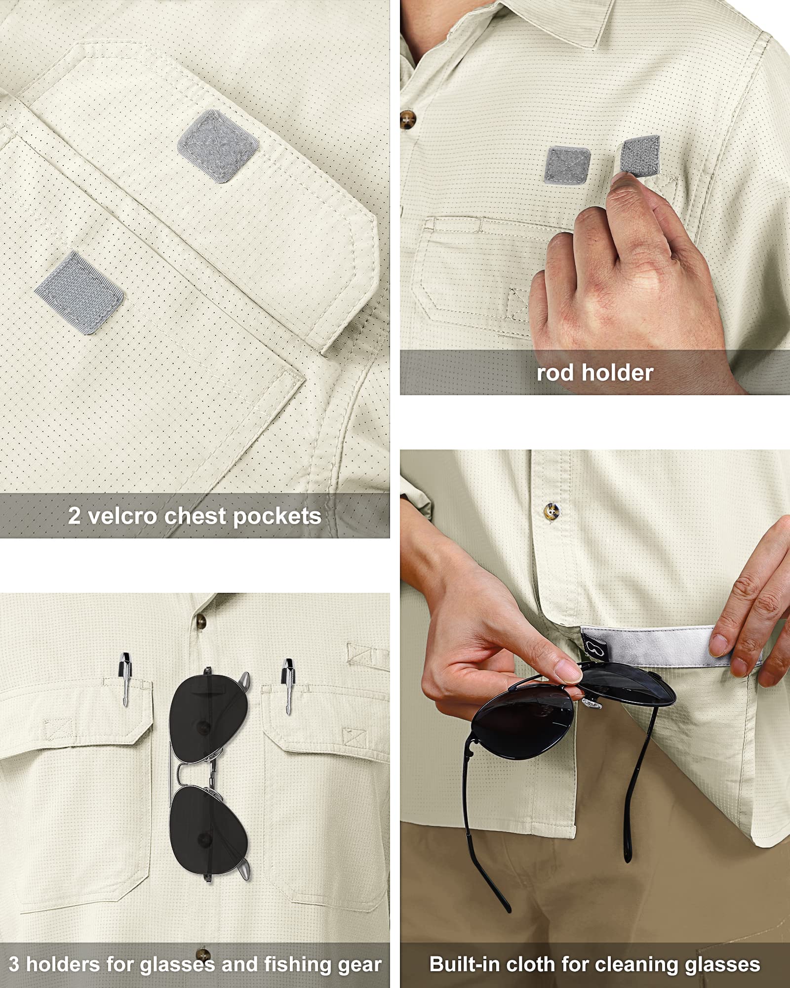 • 【Functional Design for Outdoors】 This hiking shirts have 2 chest utility pockets with sunglasses loop and pen holder slot for convenient storage; A rod holder provides hands-free convenience and a built-in glasses cleaning cloth at the hem allows you to clean glasses or shades on the go.