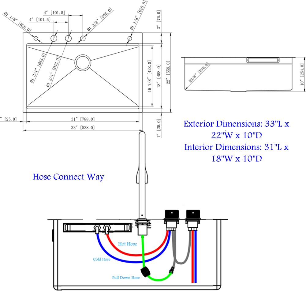 • Sink Dimension:Exterior Dimensions: 33"L x 22"W x 10"D, Interior Dimensions: 31"L x 18"W x 10"D. Standard 3-1/2" Drain Opening That Fits the Most Common Garbage . If you have any problem during installation, please feel free to contact us.