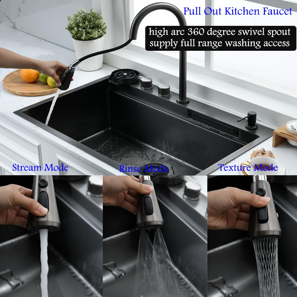 33 Inch Black Waterfall Drop In Kitchen Sink with Fuacet Combo-Bokaiya 33x22 Waterfall Kitchen Sink with Cup Washer Stainess Steel Top Mount 16 Gauge Deep Single Bowl Modern Kitchen Sinks