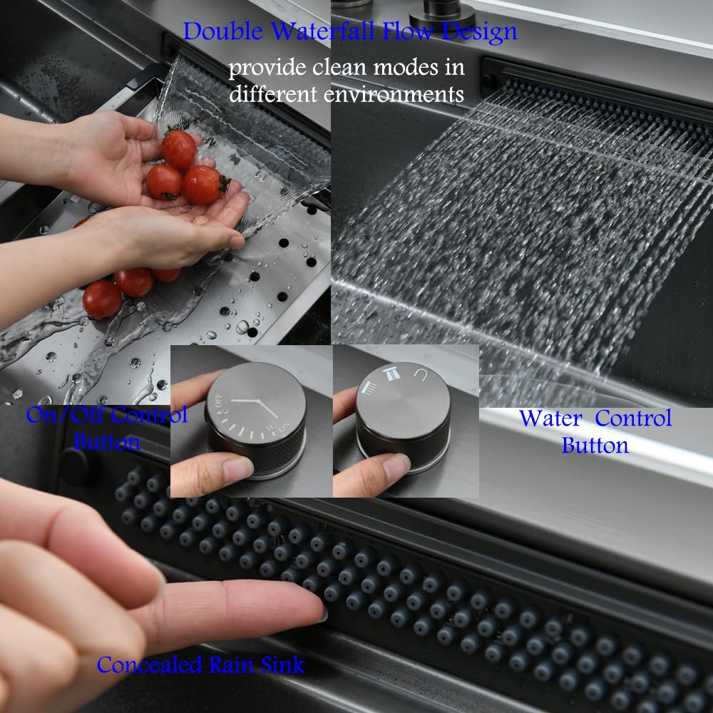 • Multifunctional Waterfall Sink: This concealed waterfall drop in kitchen sink has 2 water outlet modes, one is powerfull water, the other is gentle water. Suitable for use in different environment. Kitchen sink 33x22 drop in with steps which overhanging lips on the front and back as a track for sliding the built-in accessories convert your sink to a workspace.