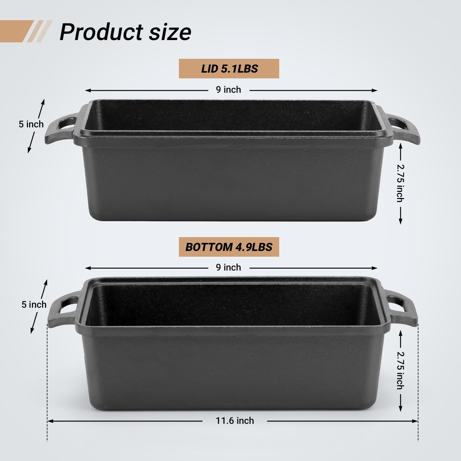 • 【9"×5" STANDARD LOAF PAN】2 in 1 sets cast iron loaf pan with lid give you more ways to use, it can be used separately as bread loaf pans for homemade bread, or as each other's lids when you need a perfect crisp crust, just like a dutch oven. It’s a must have for sourdough bread baking supplies.