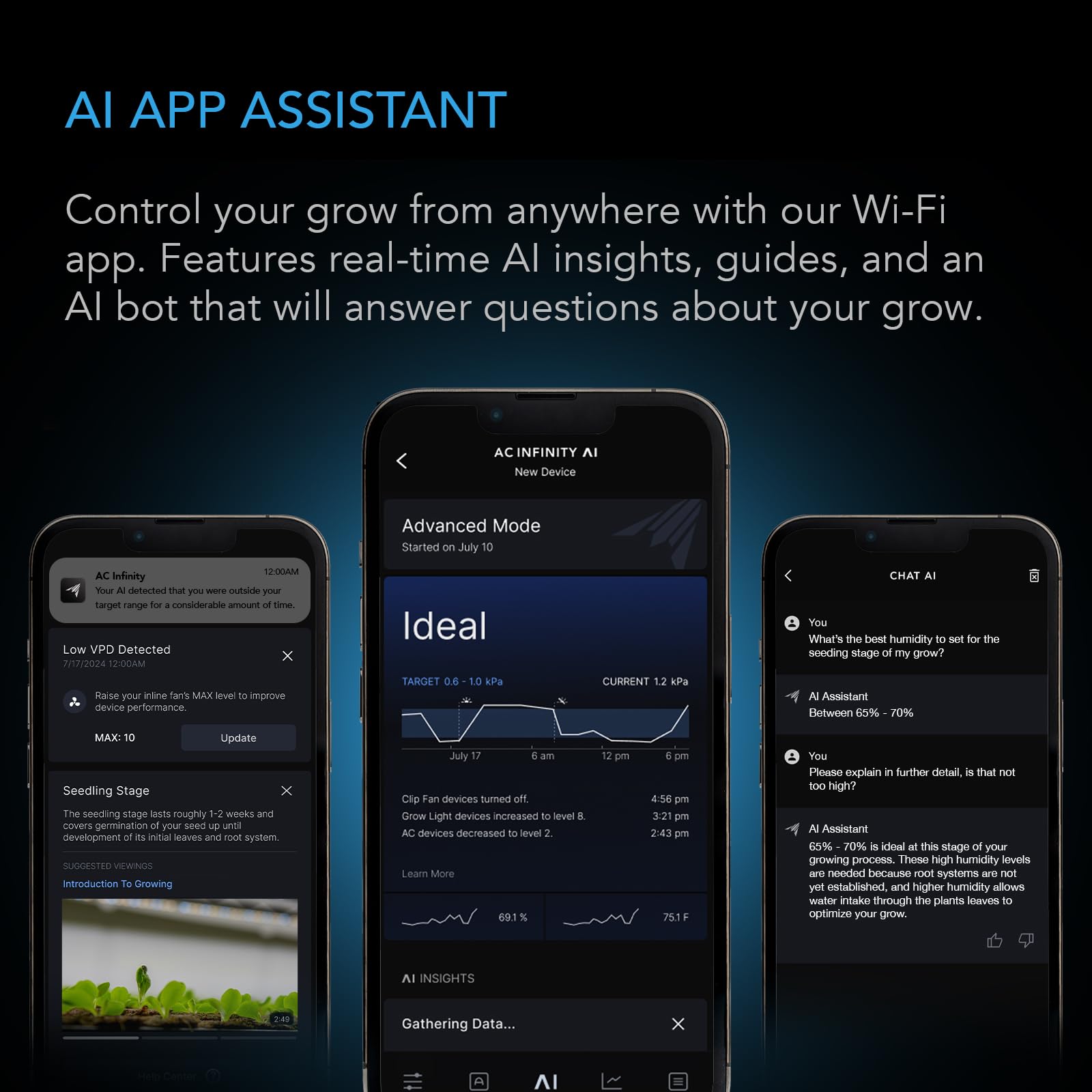 • Control your setup from anywhere via WIFI with our app, featuring real-time AI insights, guides, alerts, charts, and the ability to chat with our AI bot about your grow.