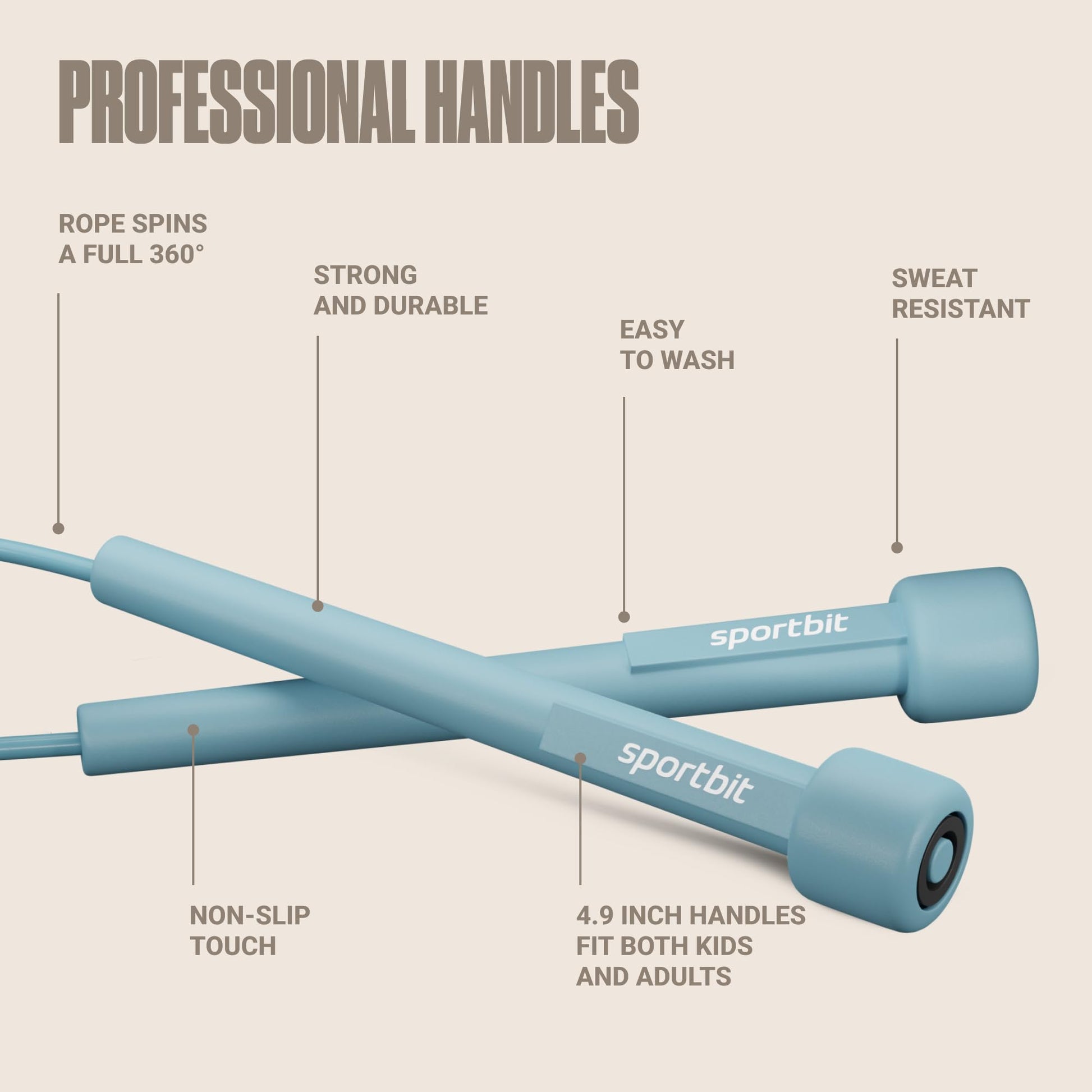 • SWEAT-RESISTANT HANDLES: The ergonomically designed 4.8-inch long handles will fit adult hands. The handles on our jumping rope are easy to wash and non-slip. Plus, they have a 360° jumprope spin, ensuring smooth rotation.